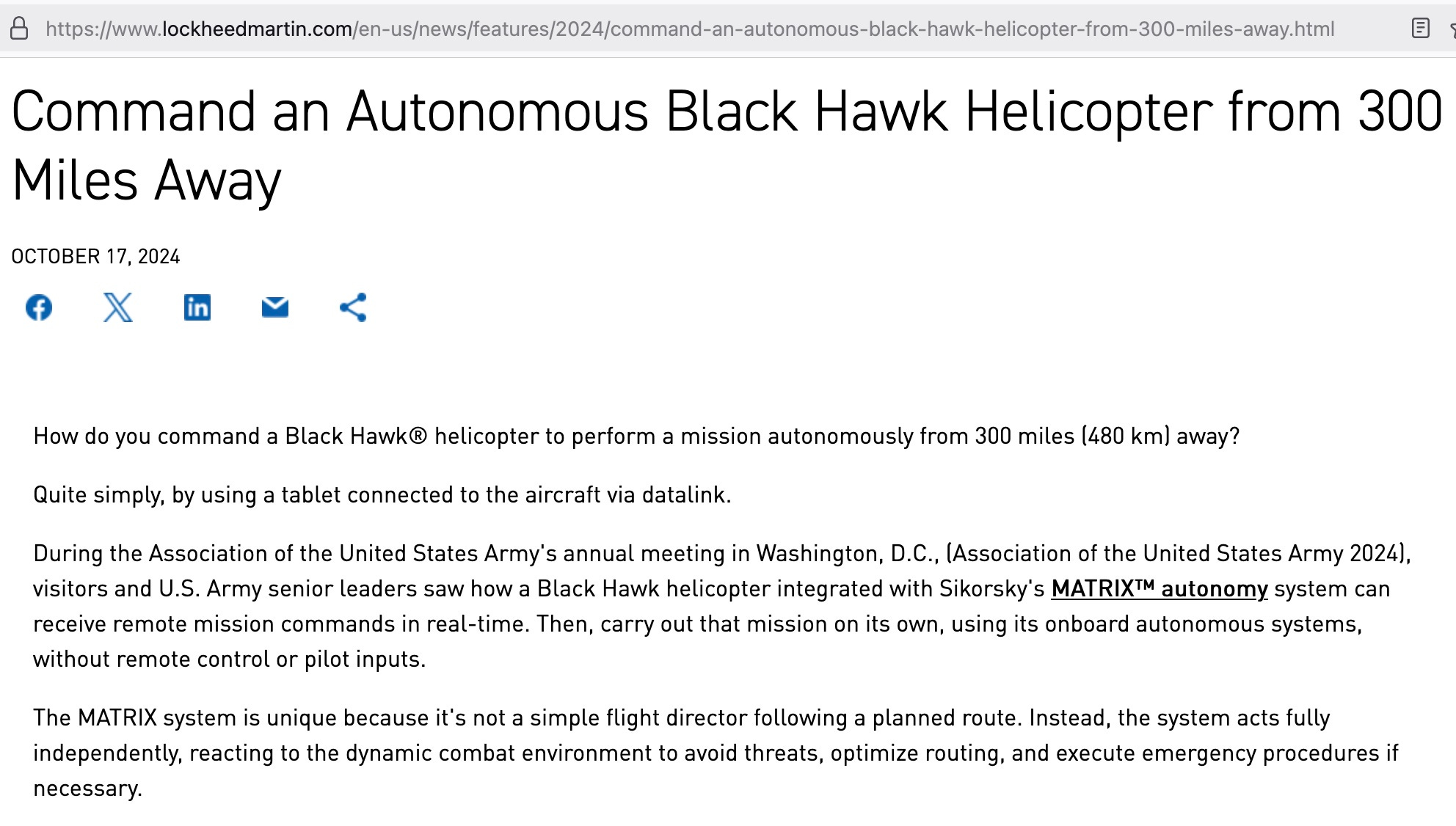 Following more than ten years of co-development with the Defense Advanced Research Projects Agency (DARPA), the MATRIX autonomy system is operationally tested. MATRIX will enable contested logistics and operational flexibility with any aircraft, any operator, and in any weather/environment to deliver mission critical, time sensitive sustainment to the point of need.