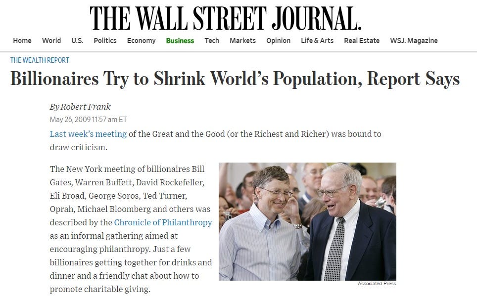 Flash back to 2009. According to the Wall Street Journal: “Billionaires Try to Shrink World’s Population”.
