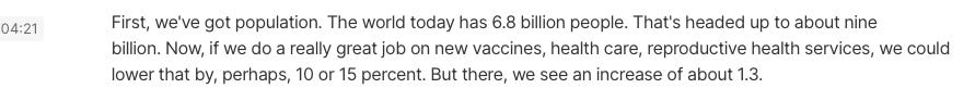 “The world today has 6.8 billion people. That’s heading up to about nine billion. Now if we do a really great job on new vaccines, health care & reproductive health services, we could lower that by perhaps 10 or 15 percent.”