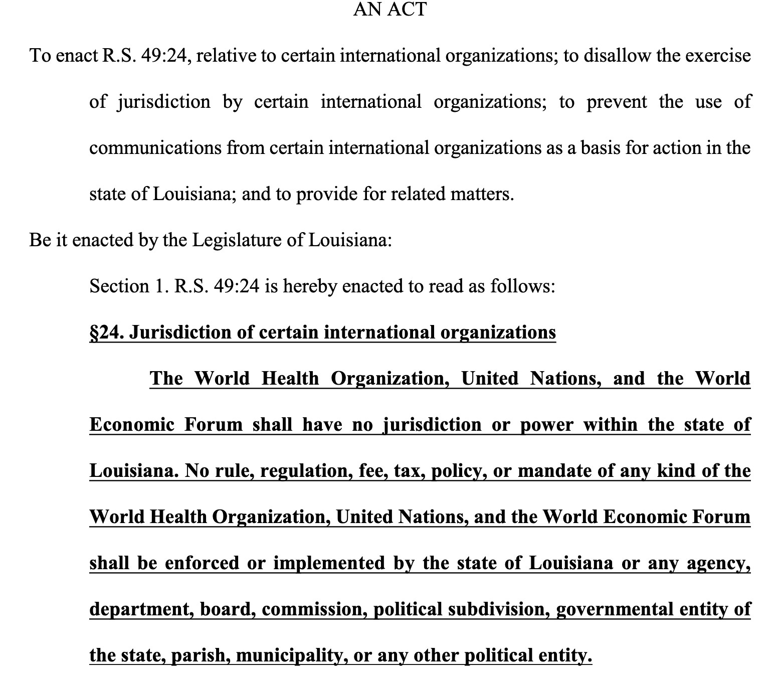 Louisiana did it! SB133 passed the House. No WHO tentacles in Louisiana