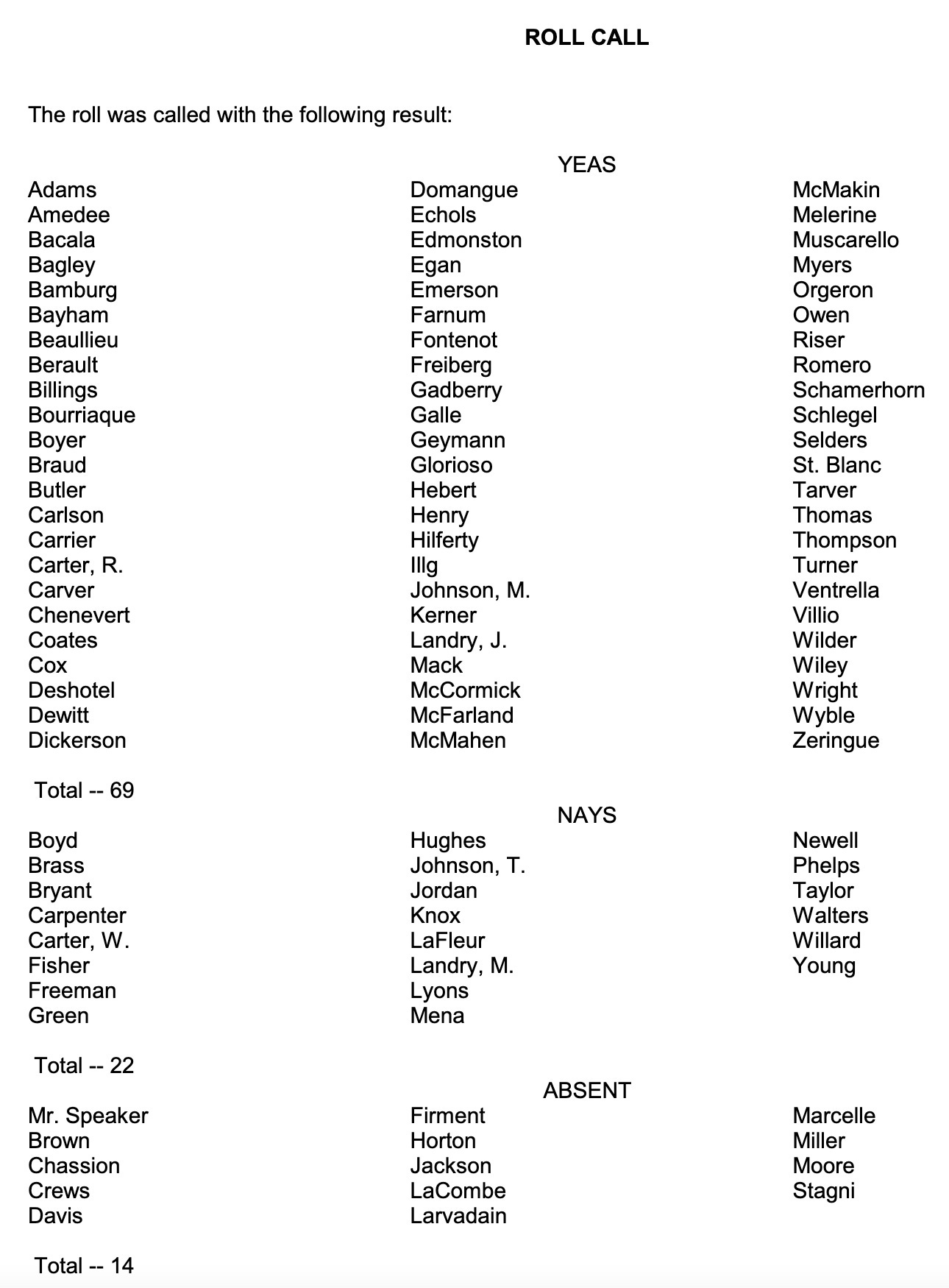 Below is the bill language, and below it the roll call of all those voting and those lawmakers who were absent today.
