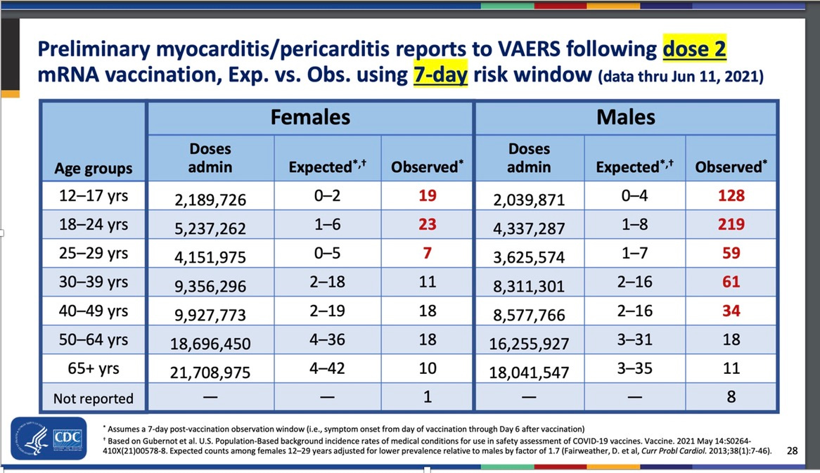 Below you can see early evidence revealing that by June 2021 the government was well aware of the myocarditis problem in young men and women. So the brief benefit from the vaccine, which vanishes by 6 or 7 months, is accompanied by a risk of acute or chronic heart disease that is greatest in those who benefit least.