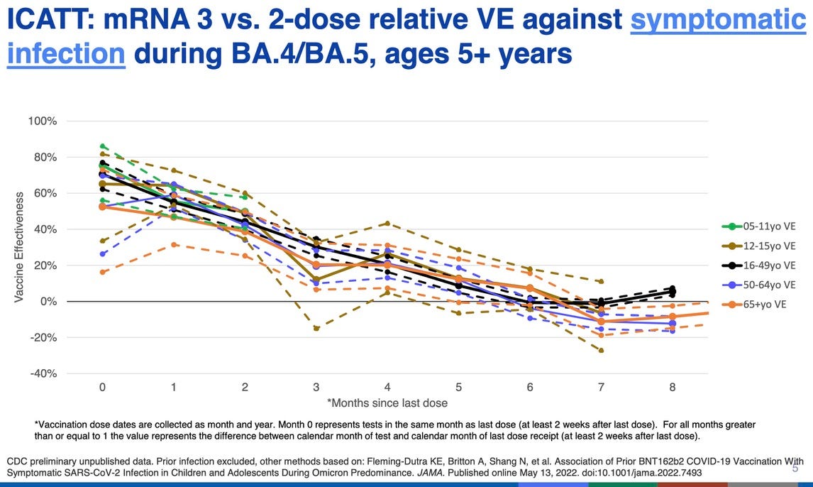 The CDC slide above was used at an advisory commttee meeting. It is not perfect. But it does show that for every age group, identified by color, efficacy of the original COVID mRNA vaccines dropped rapidly, getting to zero by about six months. We can also see the vaccine barely works for the elders who are most at risk of a bad outcome.