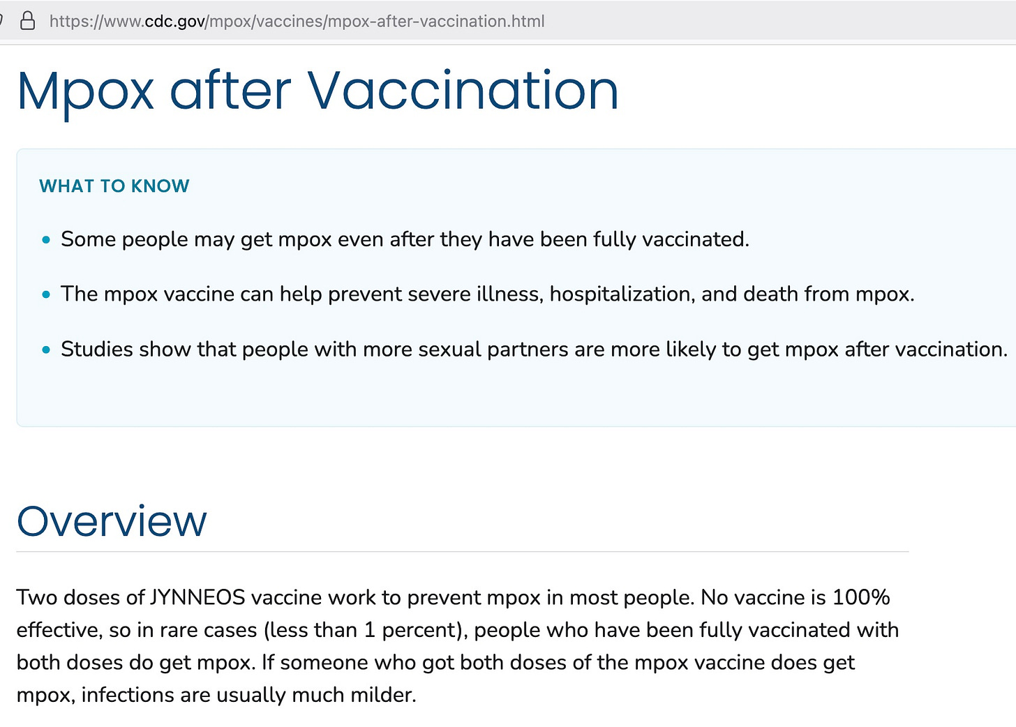 CDC makes different claims about this vaccine on the same page. First, CDC says, “The mpox vaccine can help prevent severe illness, hospitalization, and death from mpox.” Further down it says, “The vaccine may help protect you against severe infection, hospitalization, and death.”