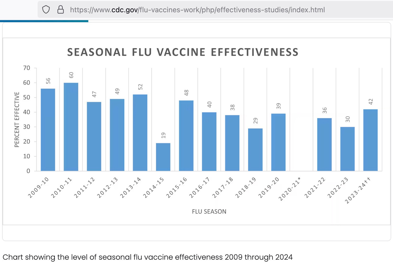 Let’s look at the last ten years and average them for efficacy, omitting the empty year of 2020-21. Average efficacy is 35.7%. That means that the shot works for about 1/3 of the people who receive it: if they are exposed they won’t get the flu. It does not help 64.3% of those who receive it. Efficacy will be a bit less if you look at other studies. Flu shot recipients have been shown to be a healthier group than non-recipients, which makes the vaccine appear more effective.