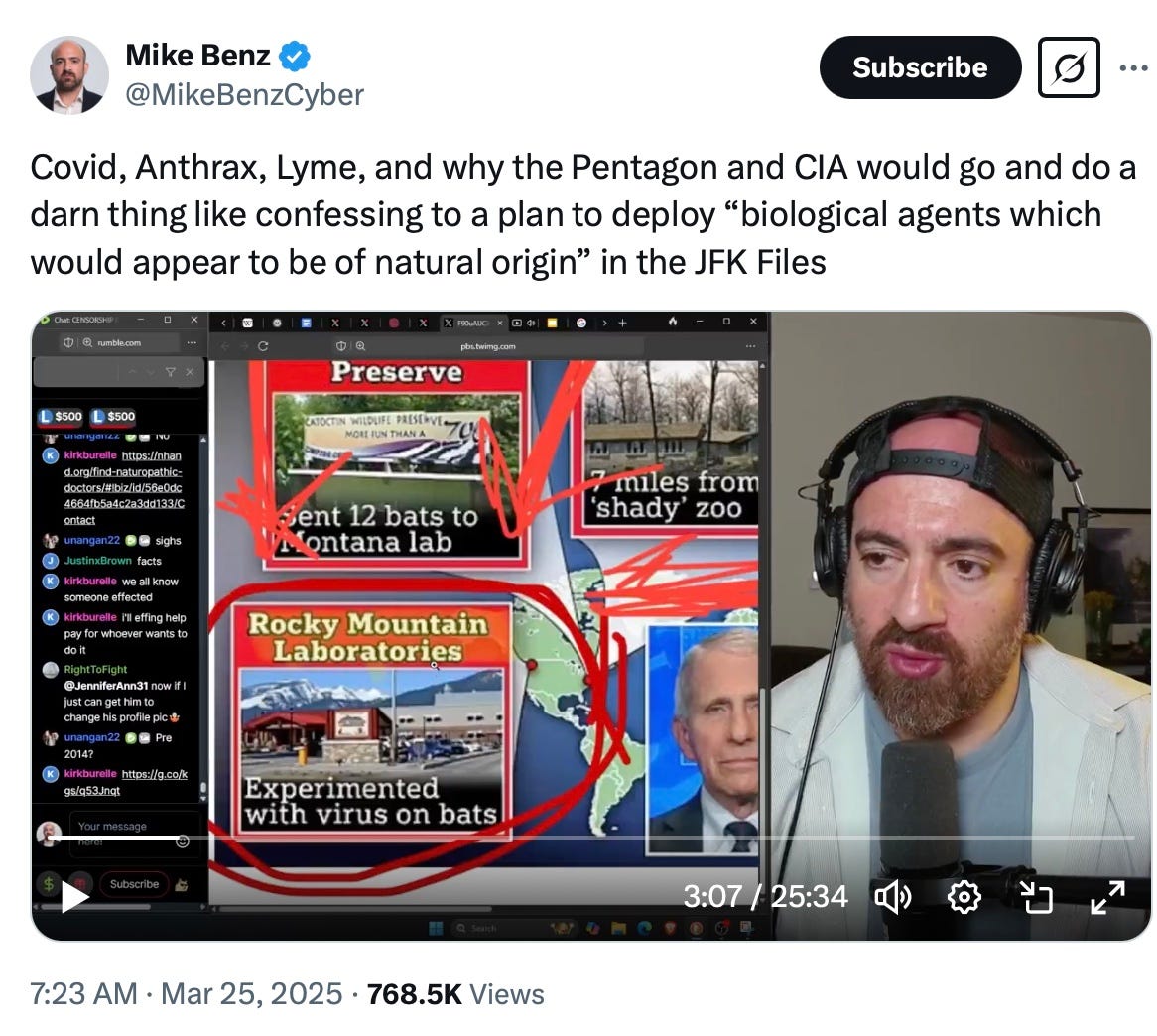 Mike Benz on starvation warfare and the USG Rocky Mountain lab, MT, where Lyme disease and SARS-CoV-2 may have been created25 mins. Drs. Burgdorfer and Munster are the most likely disease innovatorsMeryl NassMar 27, 20251152513Sharehttps://x.com/MikeBenzCyber/status/1904494284872540256PreviousNext