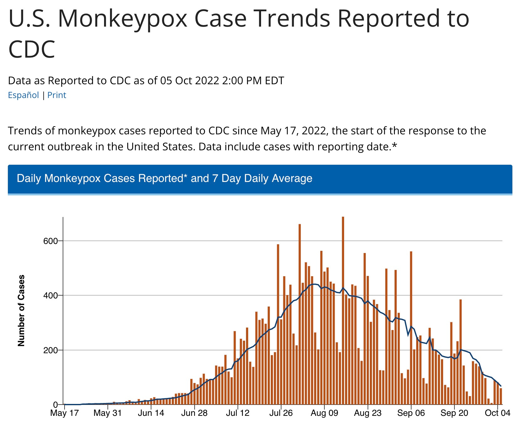 CDC buried the graph below, but eventually I found it. New monkeypox cases are only one fifth what they were in August, a mere 8 weeks ago. Soon it will be gone.
