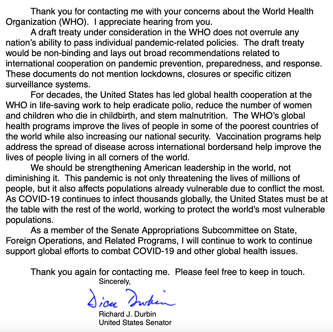 In response to one of our supporters, Democrat Senator Dick Durbin admitted that the WHO documents are a “treaty.” But then his written response listed three lies, which I want to unpack below.