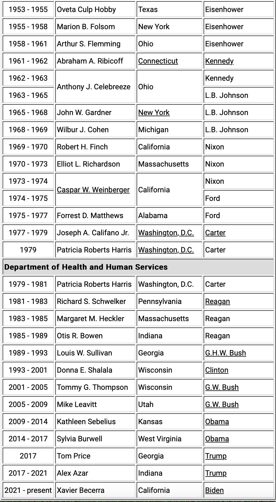 Here are all the Secretaries of the Department of Health, Education and Welfare (1953-1979) and the Secretaries of the Department of Health and Human Services (after 1979, when Education got its own department)