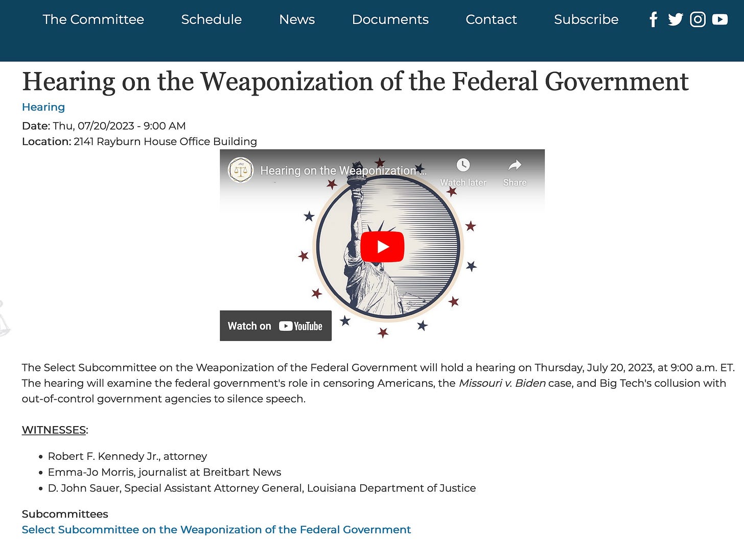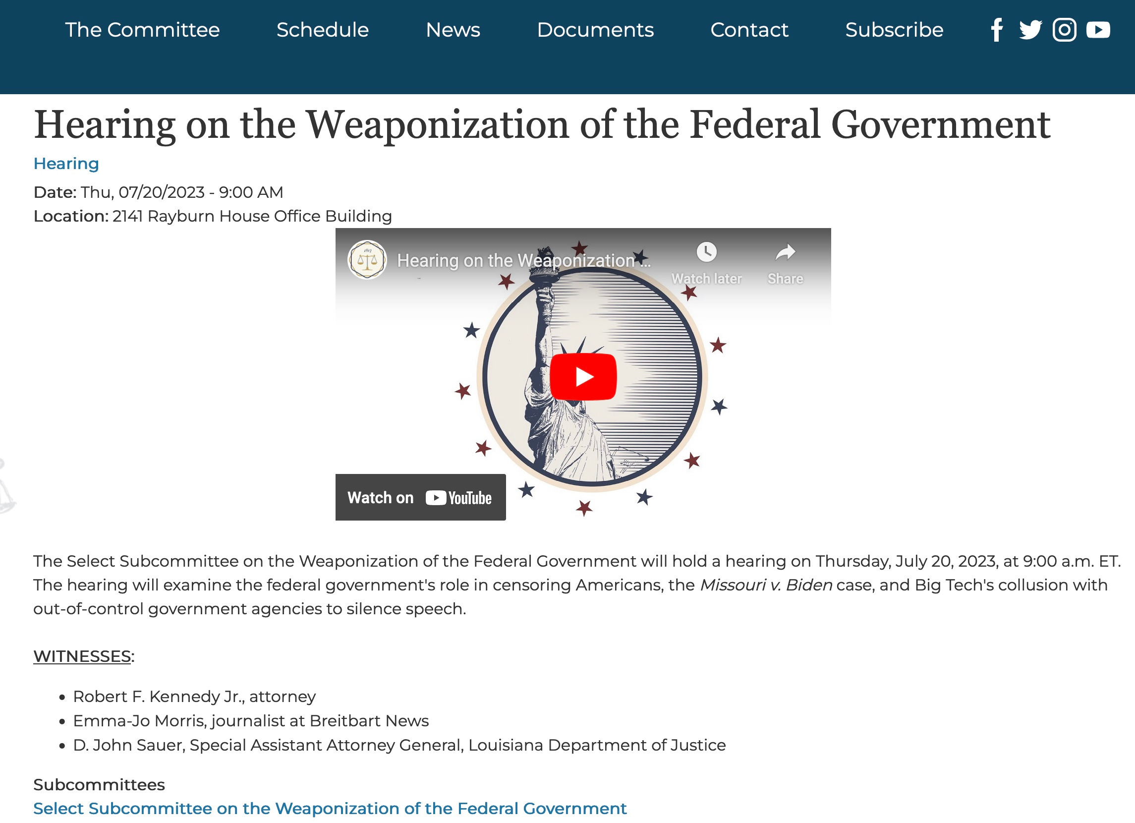 “The Select Subcommittee on the Weaponization of the Federal Government will hold a hearing on Thursday, July 20, 2023, at 9:00 a.m. ET. The hearing will examine the federal government's role in censoring Americans, the Missouri v. Biden case, and Big Tech's collusion with out-of-control government agencies to silence speech.”