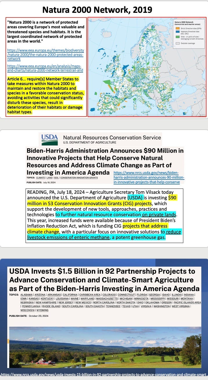 Large swathes of land are being designated as preserves for biodiversity, and the private owners are being restricted as to the uses of their land. One way this is being accomplished has been via USDA paying farmers for "climate smart" agriculture and easements on their land for conservation purposes, which can restrict the uses to which their private land can be put.