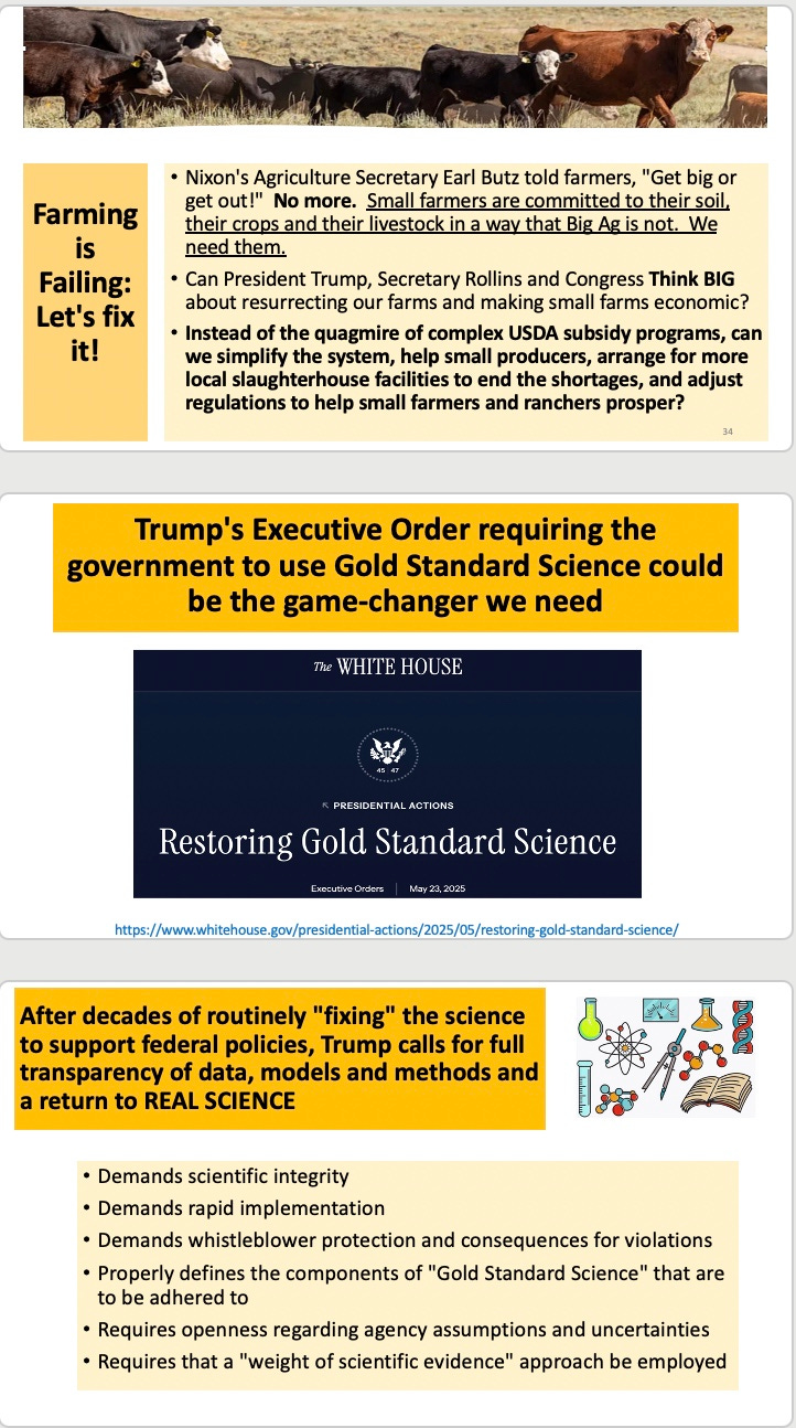 6. End decades of corrupt federal science, which President Trump has initiated with his Executive Order of May 23 on Gold Standard Science, helped along by HHS officials. This could be an amazing game-changer. It demands scientific integrity, rapid implementation, whistleblower protections, consequences for violations, and properly defines what gold standard science standards must be adhered to.