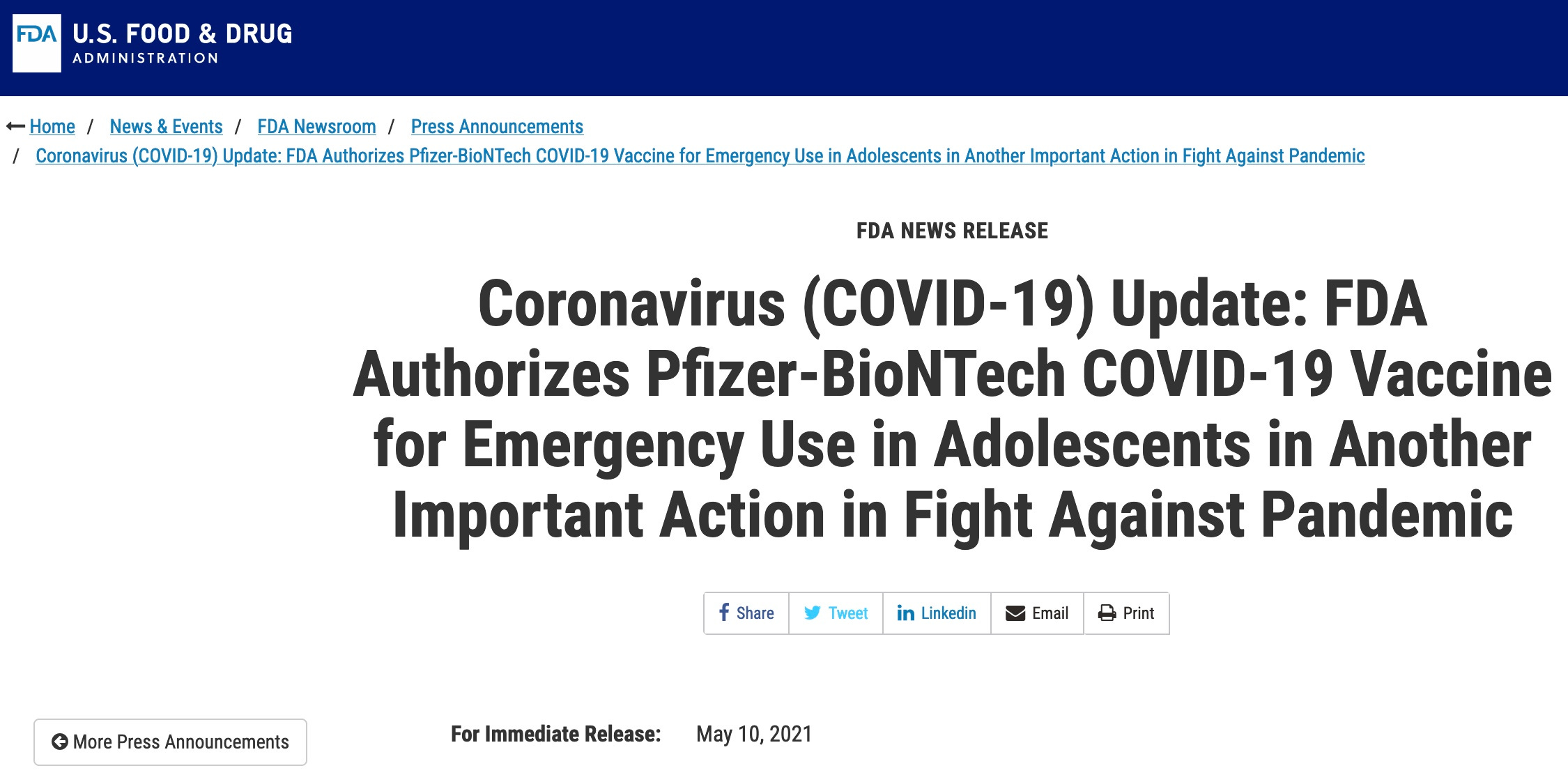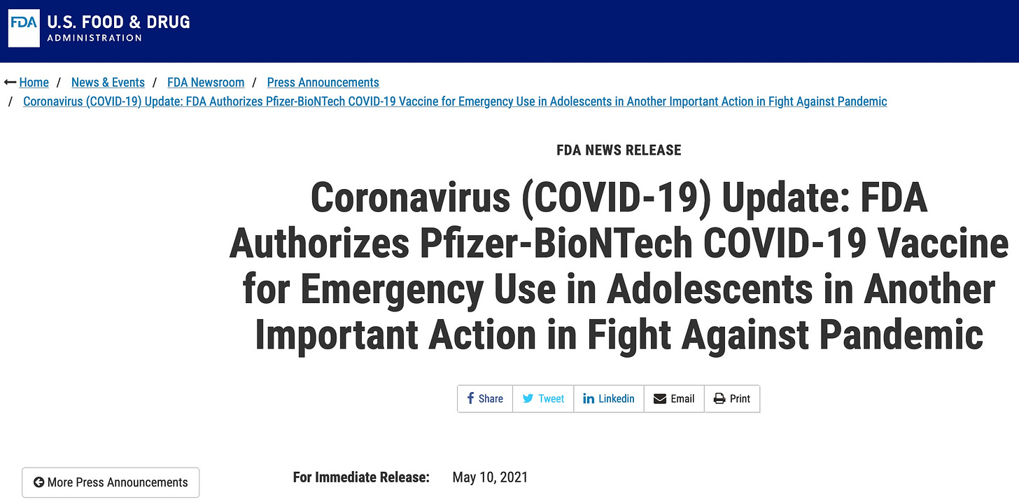 The CDC and FDA and ? managed to keep the story under wraps, denying any vaccine problems at an advisory committee meeting. Because what did FDA do on May 10, 2021? It authorized the dangerous vaccine for adolescents who FDA knew were at high risk for myocarditis, carefully hiding that data, and failed to disclose it in the Fact Sheet (despite being required to do so in the 2005 Prep Act).