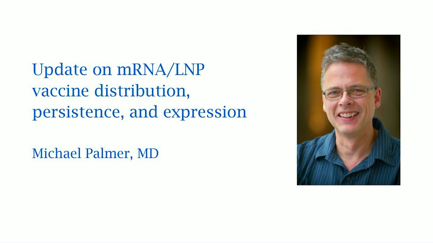 Chapter 5 discusses how our body reacts to the mRNA vaccines after administration, the distribution and elimination of lipid nanoparticles and foreign mRNAs, and lipid nanoparticle toxicity. Watch Michael Palmer's presentation: