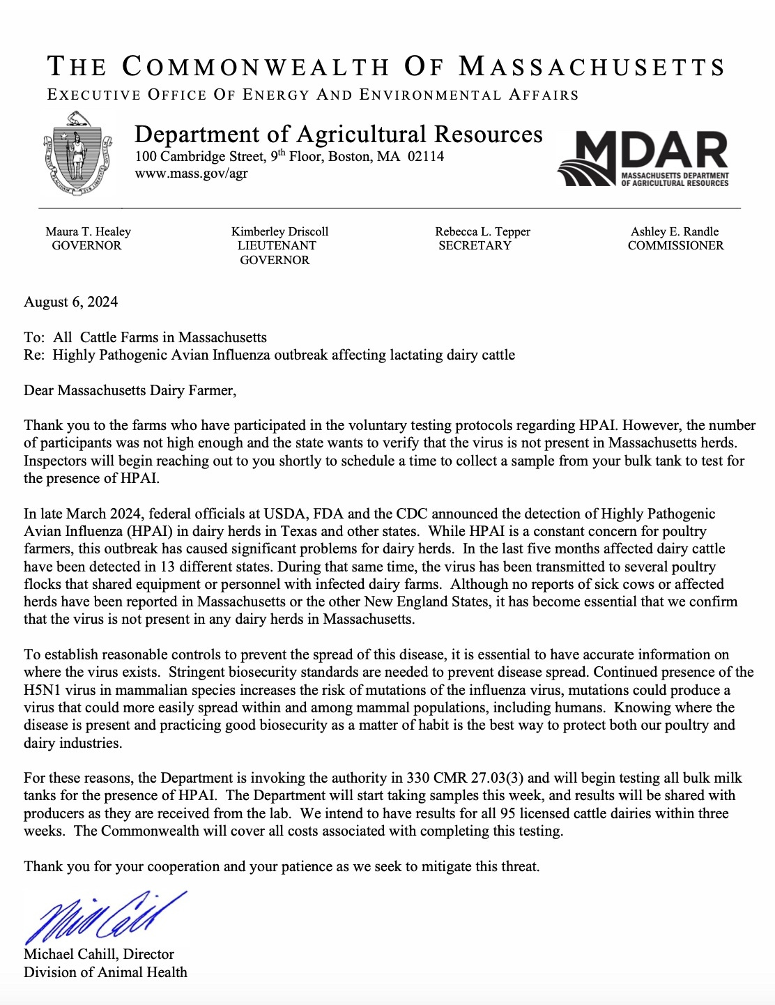 The feds do not have the right to go test healthy herds. But the states do, if sufficiently encouraged. Today Massachusetts brought down the hammer.