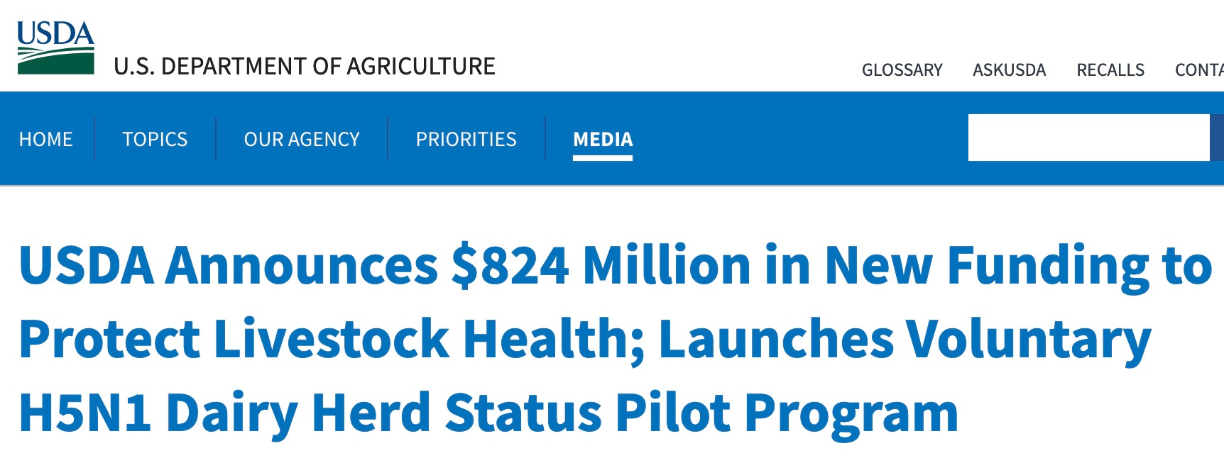 Email: press@usda.govWASHINGTON, May 30, 2024 -- The U.S. Department of Agriculture today announced it is taking several additional actions to ensure the health and viability of the nation’s livestock and poultry. In the two months since the initial detection of H5N1 in dairy cattle, USDA has worked quickly and in concert with its federal and state partners to better understand the virus and contain the disease and remains committed to seeking additional ways to collect the data needed to better understand and mitigate the risk created by this outbreak. USDA is adding an additional $824 million in emergency funding from the Commodity Credit Corporation (CCC) to bolster these efforts and is launching a new Voluntary H5N1 Dairy Herd Status Pilot Program to give dairy producers more options to monitor the health of their herds and move cows more quickly while providing on-going testing and expanding USDA’s understanding of the disease.