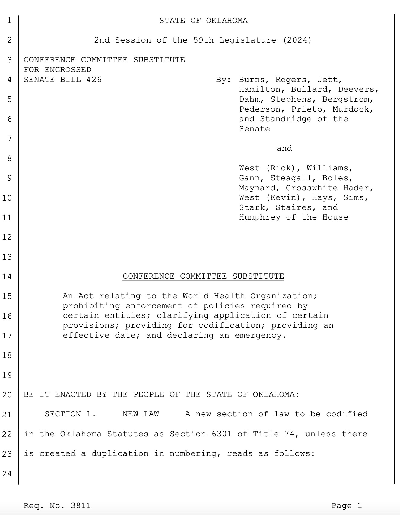 24 Governors, 22 state Attorneys-General and 49 Senators said NO to globalism, and the states are passing legislation to implement it. This will protect the citizens of Oklahoma in perpetuity from these captured organizations.