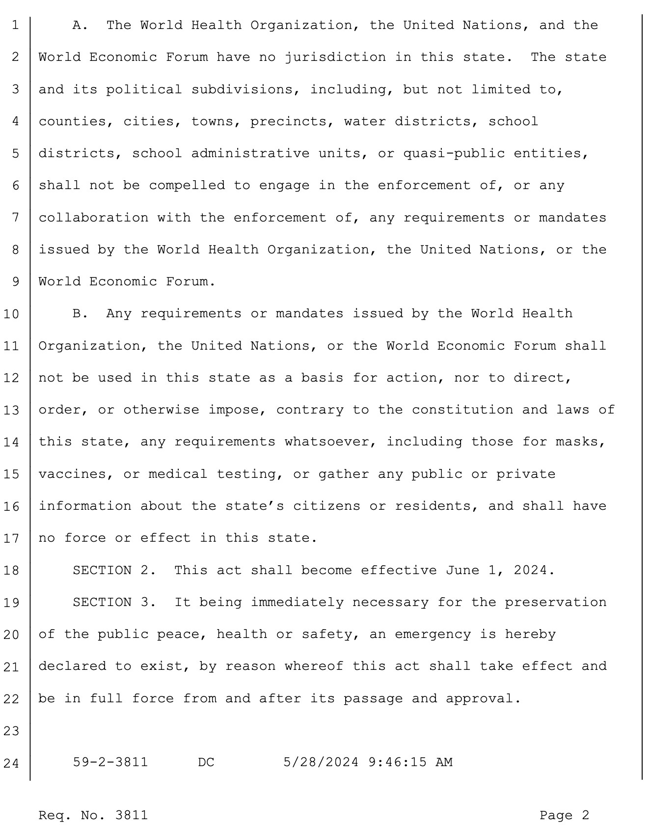 No edicts coming directly or indirectly from WHO, UN or WEF will be enforced in Oklahoma