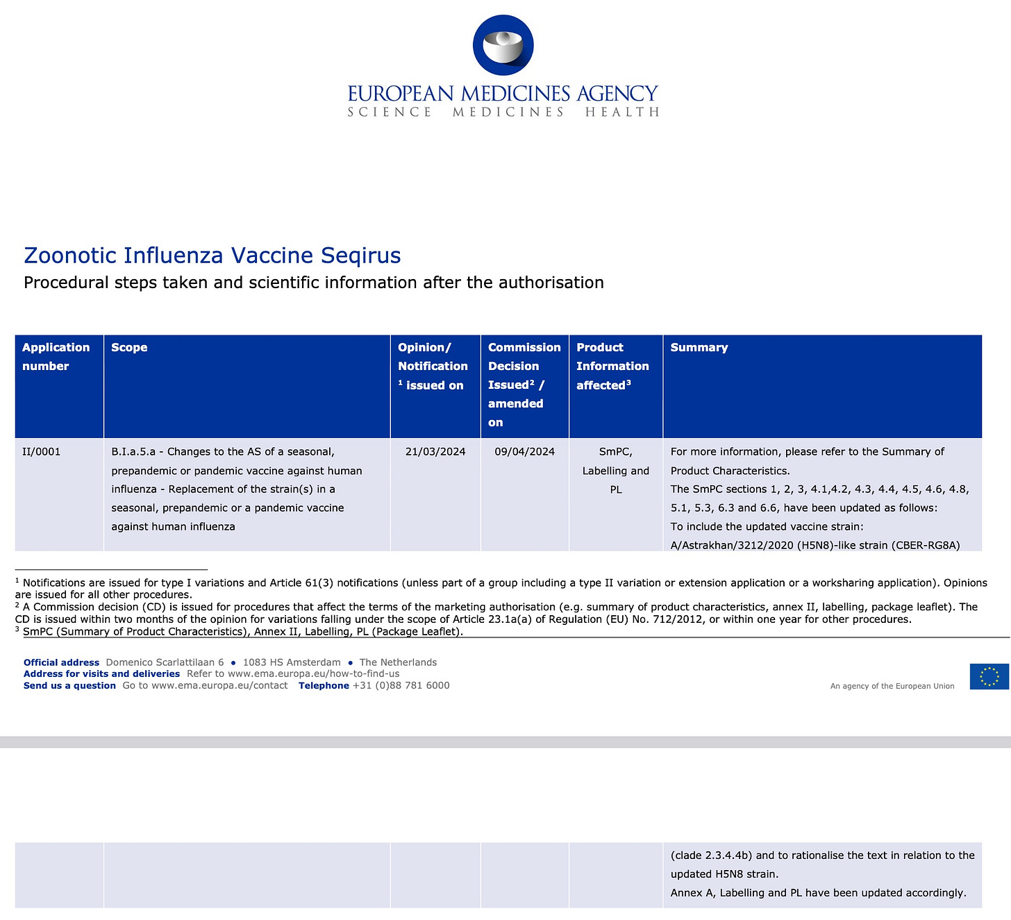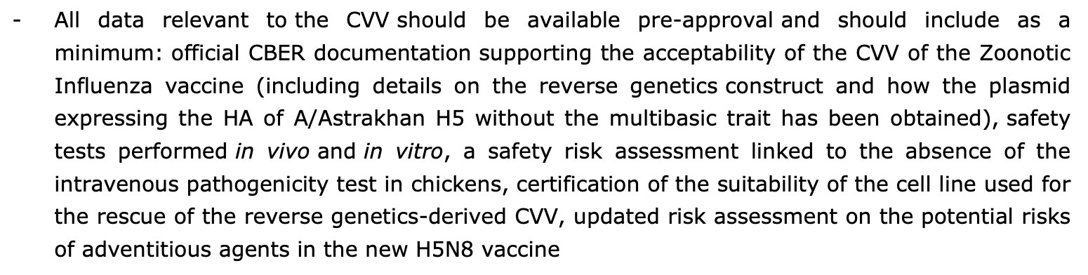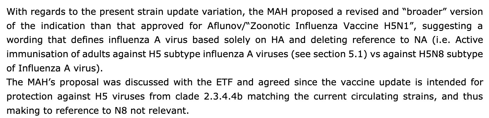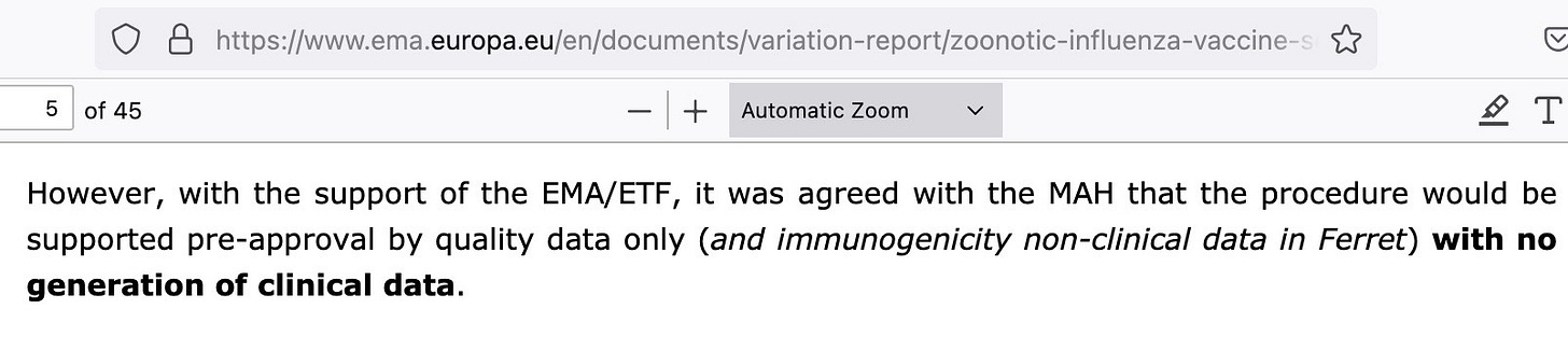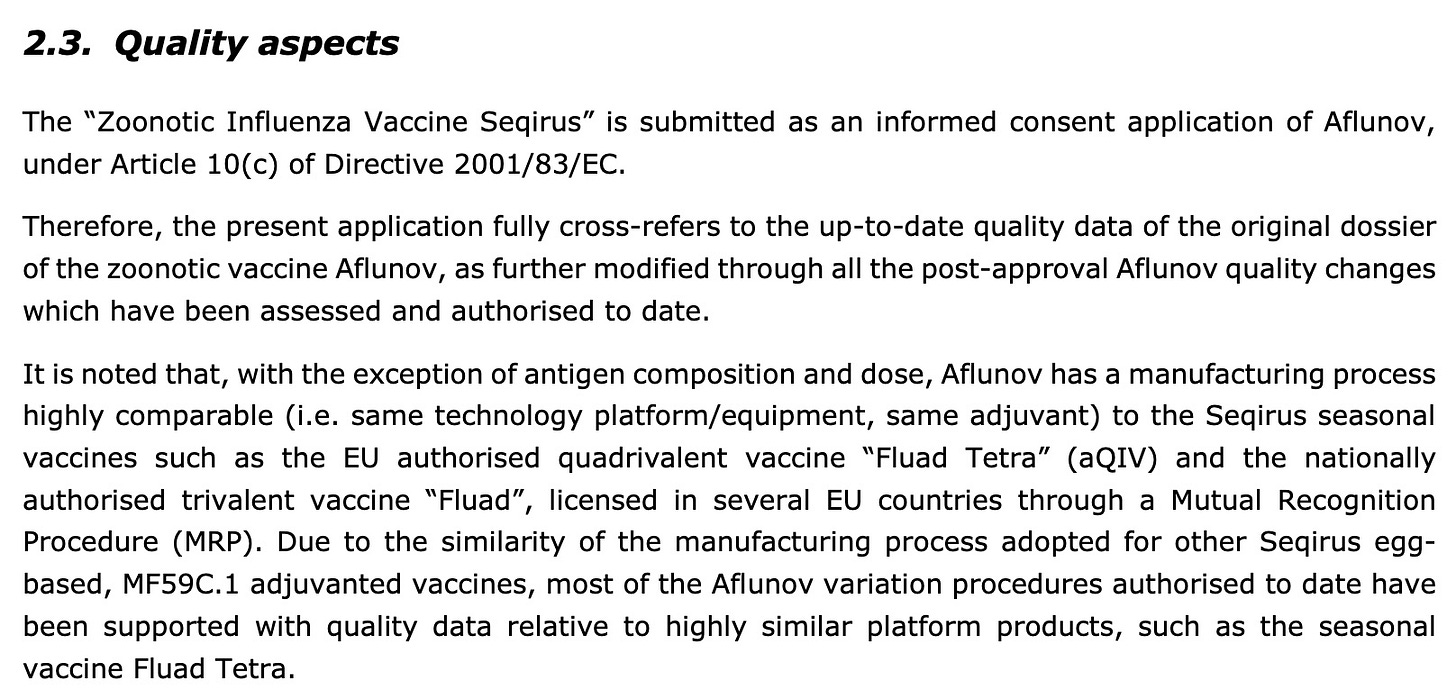 Here you have the legal explanation of how the 2023 vaccine was shoehorned into the much older Aflunov vaccine approval of a different vaccine: https://www.ema.europa.eu/en/documents/assessment-report/zoonotic-influenza-vaccine-seqirus-epar-public-assessment-report_en.pdf