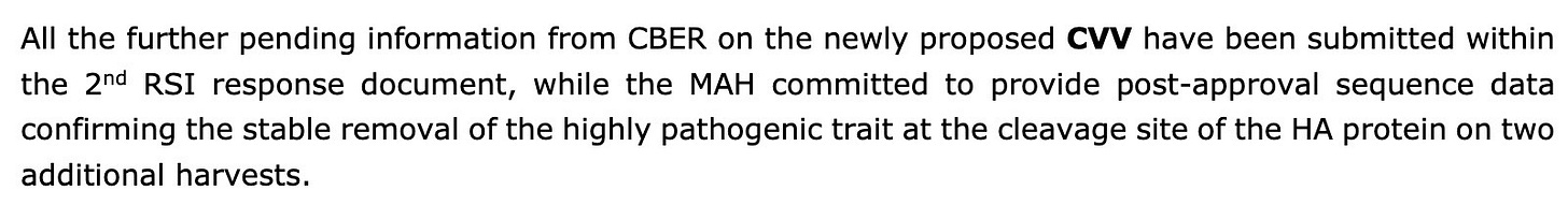 The paragraph below caught my eye, because the term multibasic when used for SARS-CoV-2 referred to the spike cleavage site. The regulators are concerned that a similar multibasic cleavage site might have been inadvertently left in the vaccine. The vaccine antigen was developed at FDA’s Center for Biologics (CBER). The regulators wanted a lot more information from FDA. They detail asking for it but not receiving it.
