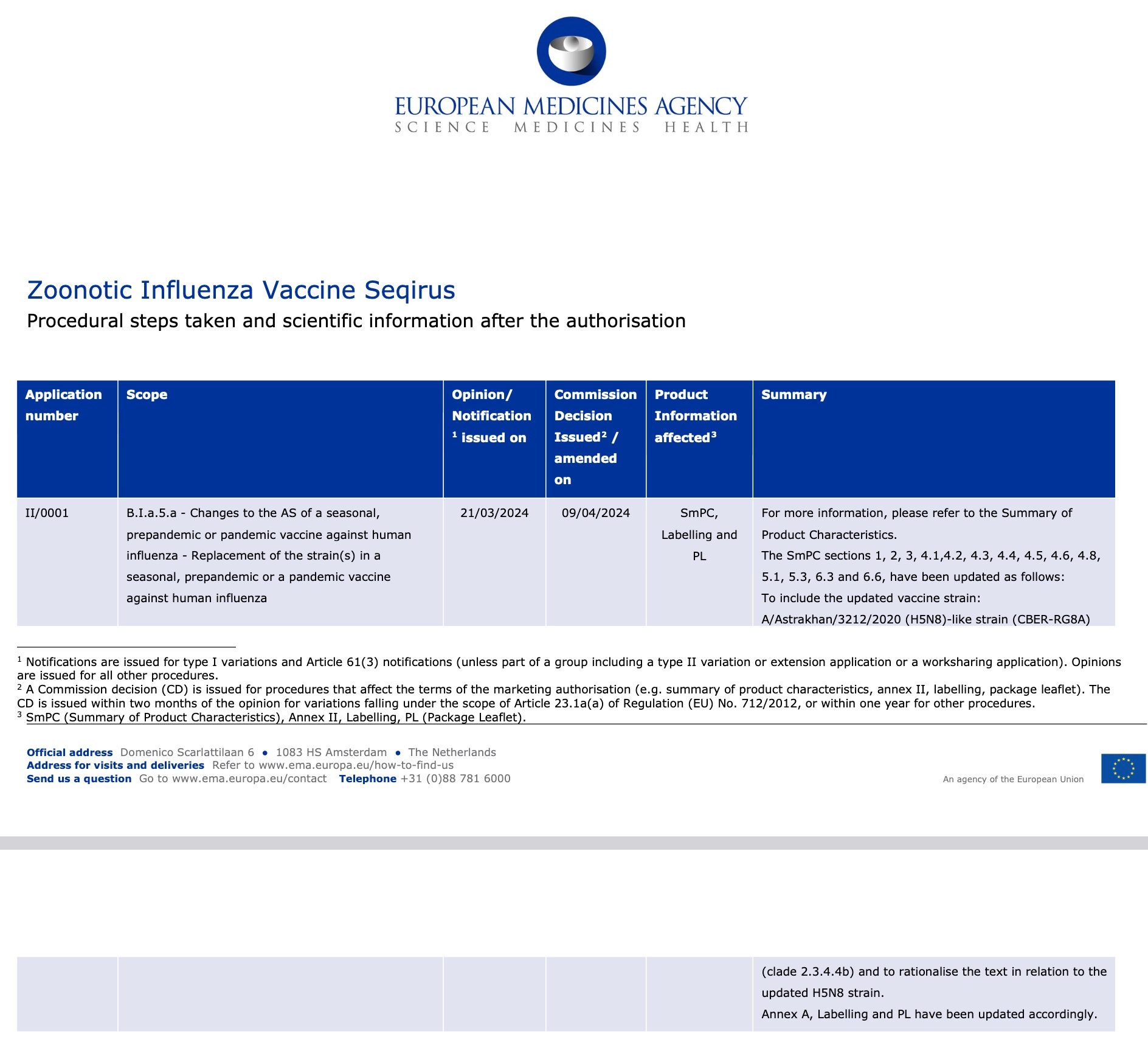 An earlier version of Sequirus’ 2024 bird flu vaccine was okayed by the EMA in 2023 as a spin-off from the original Aflunov license. Months later, the antigen component was updated to use the FDA’s H5N8 Astrakan-like strain antigen, and this second spin-off from the Aflunov license was approved in April 2024.