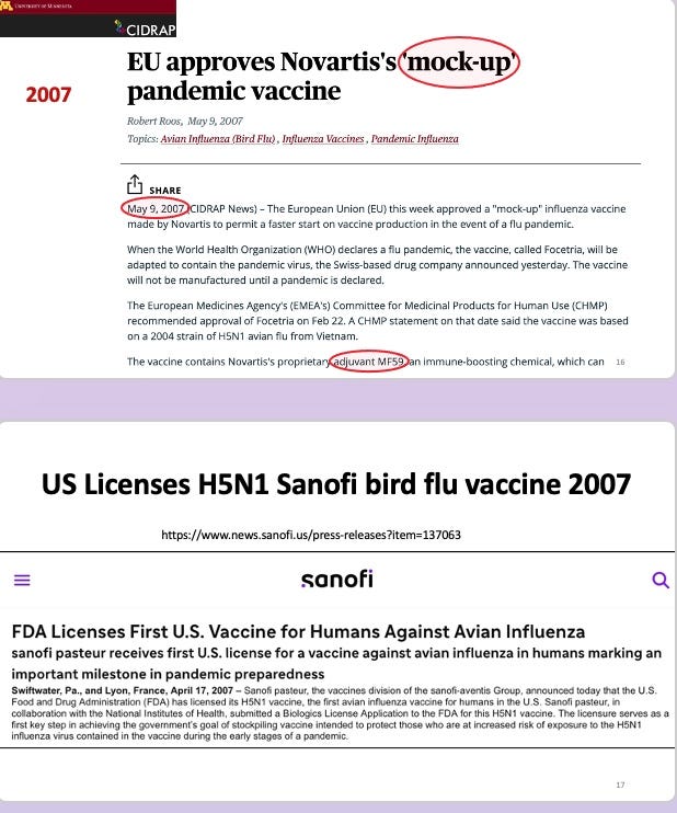 By 2007 both the US and the EU approved initial mock-up H5N1 bird flu vaccines: