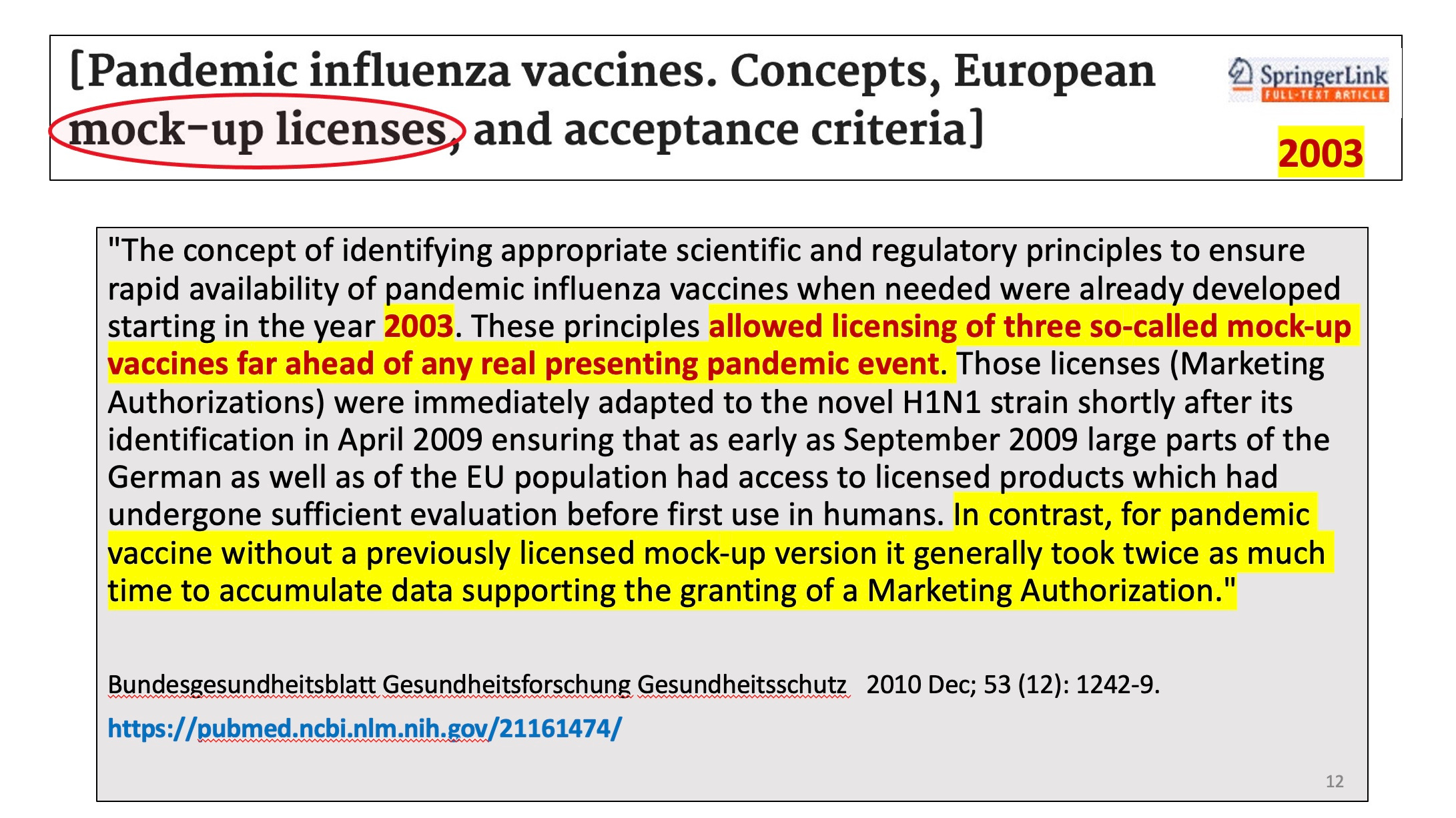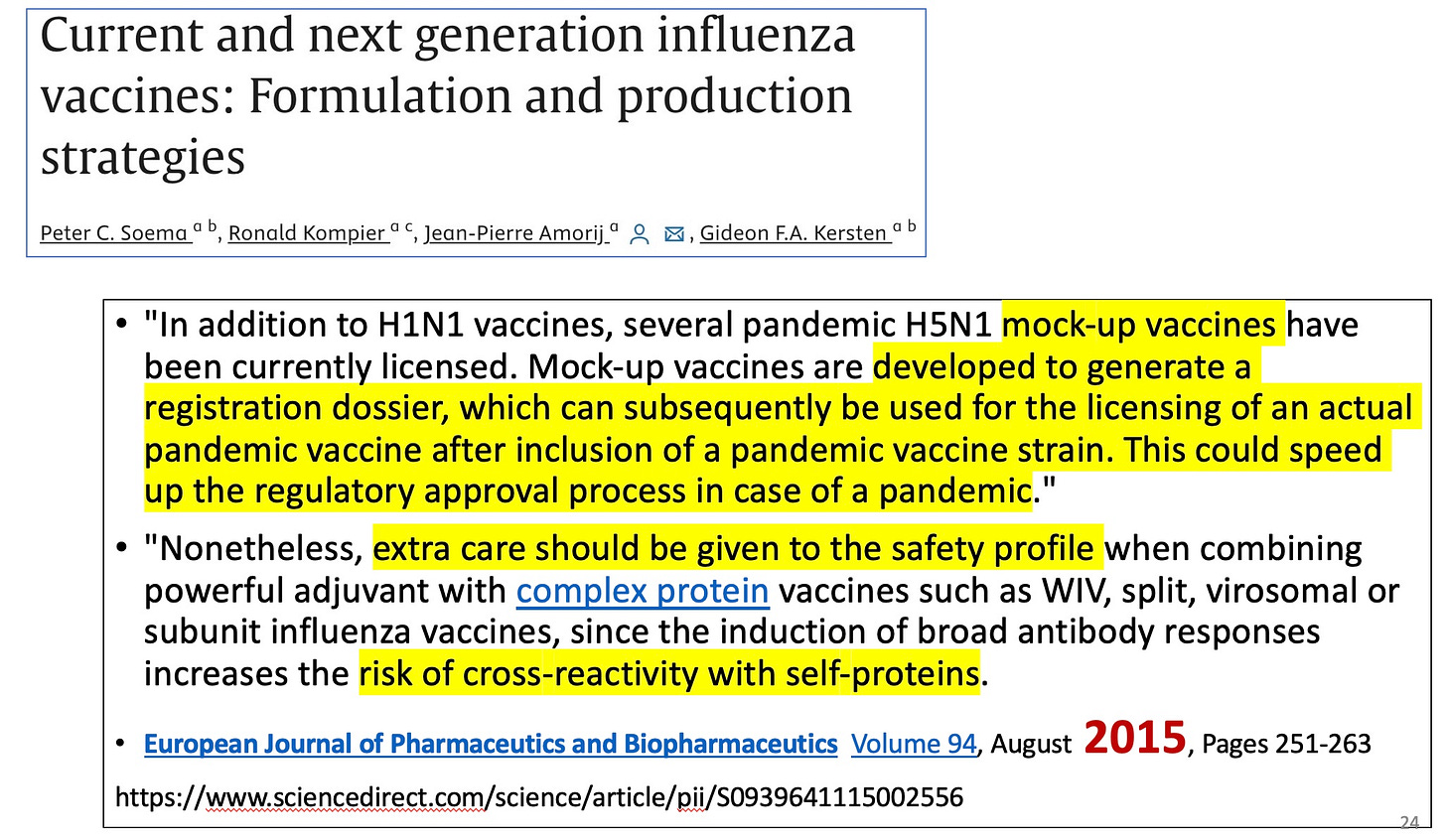 Thus the mock-up vaccine was born, where a prototype vaccine is made, but is not intended for use. It goes through the motions of a regulatory process, but no one really cares about it since it is not intended for people. At some future time, a similar vaccine, only different from the mock-up or prototype or prepandemic vaccine (these imaginary vaccines have many names to keep us confused) because it uses 1 or more different antigens, is developed quickly to respond to a pandemic. Then the regulators slap a license or an EUA or authorization on the new vaccine, based on the approval of the mock-up vaccine. Even if the mock-up vaccine may have been deadly.