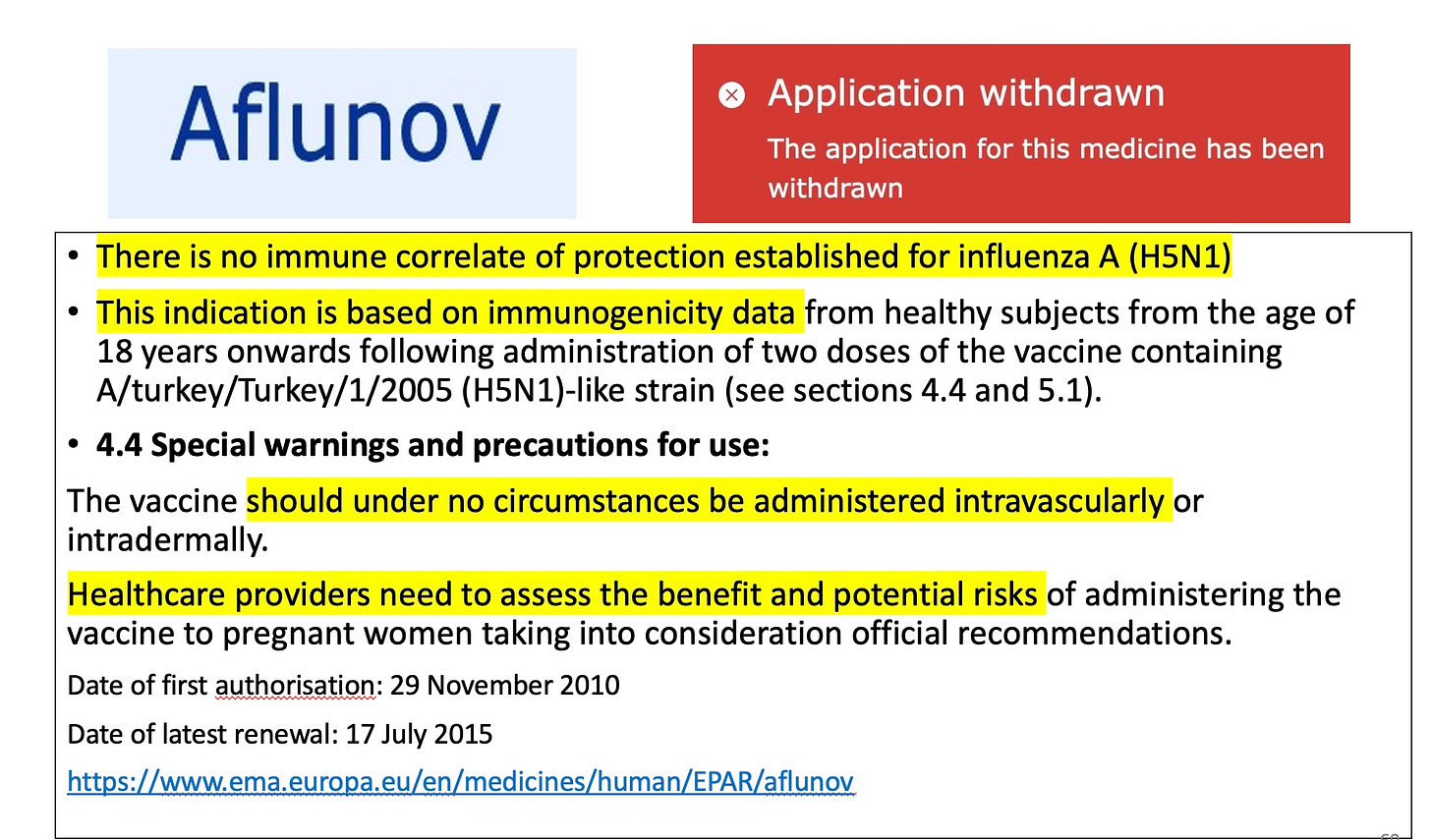So there you have it. Aflunov was approved in 2010 according to this document, essentially not used, and yet its original approval is the basis for a new vaccine to be licensed without testing in a single human being. Welcome to 21st century regulation.