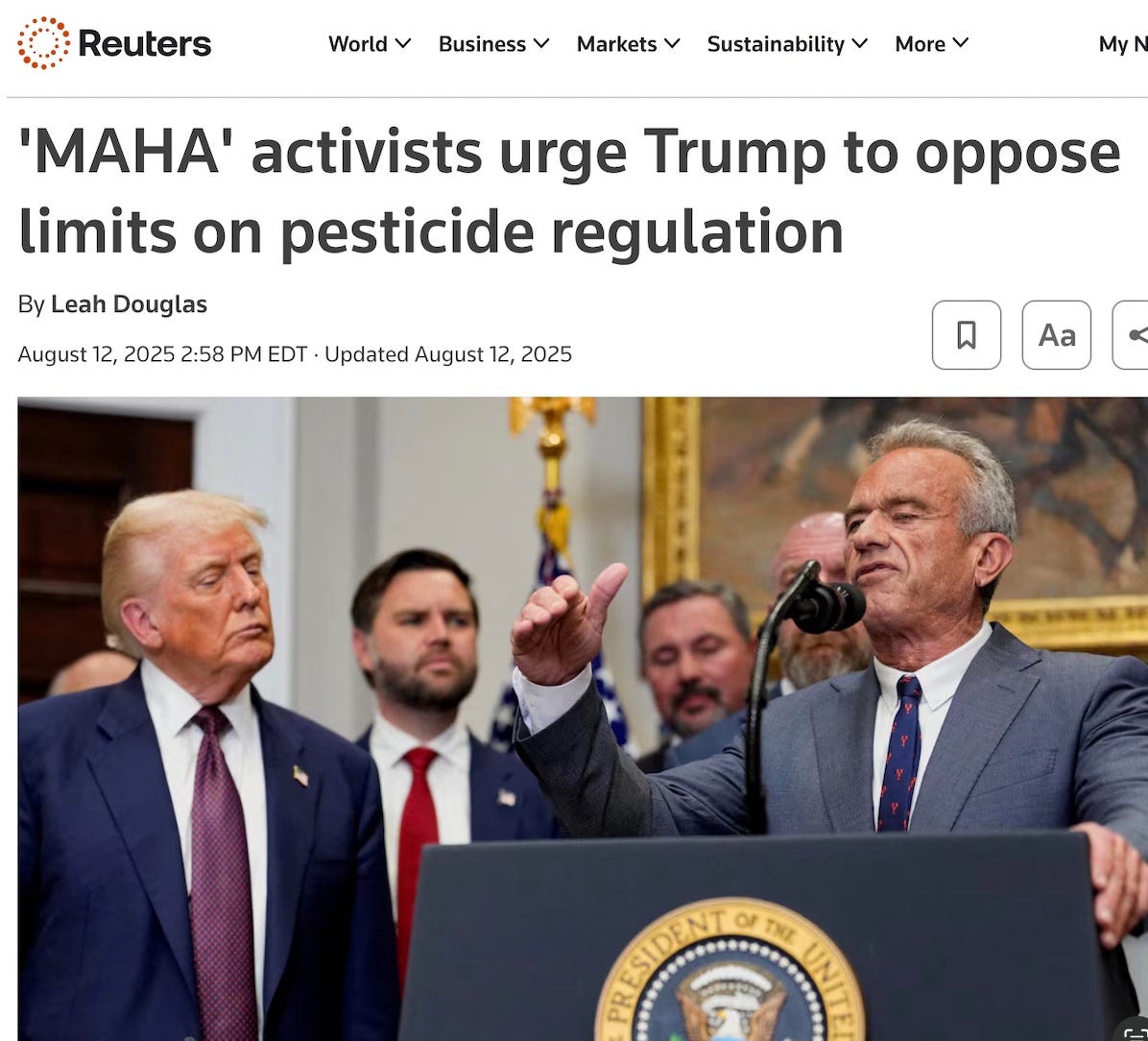 WASHINGTON, Aug 12 (Reuters) - President Donald Trump should block the U.S. House from limiting the regulation of pesticides and "forever chemicals" in its environmental appropriations bill or risk losing Republican support, more than 200 activists aligned with the "Make America Healthy Again" movement said in a letter to Trump.
