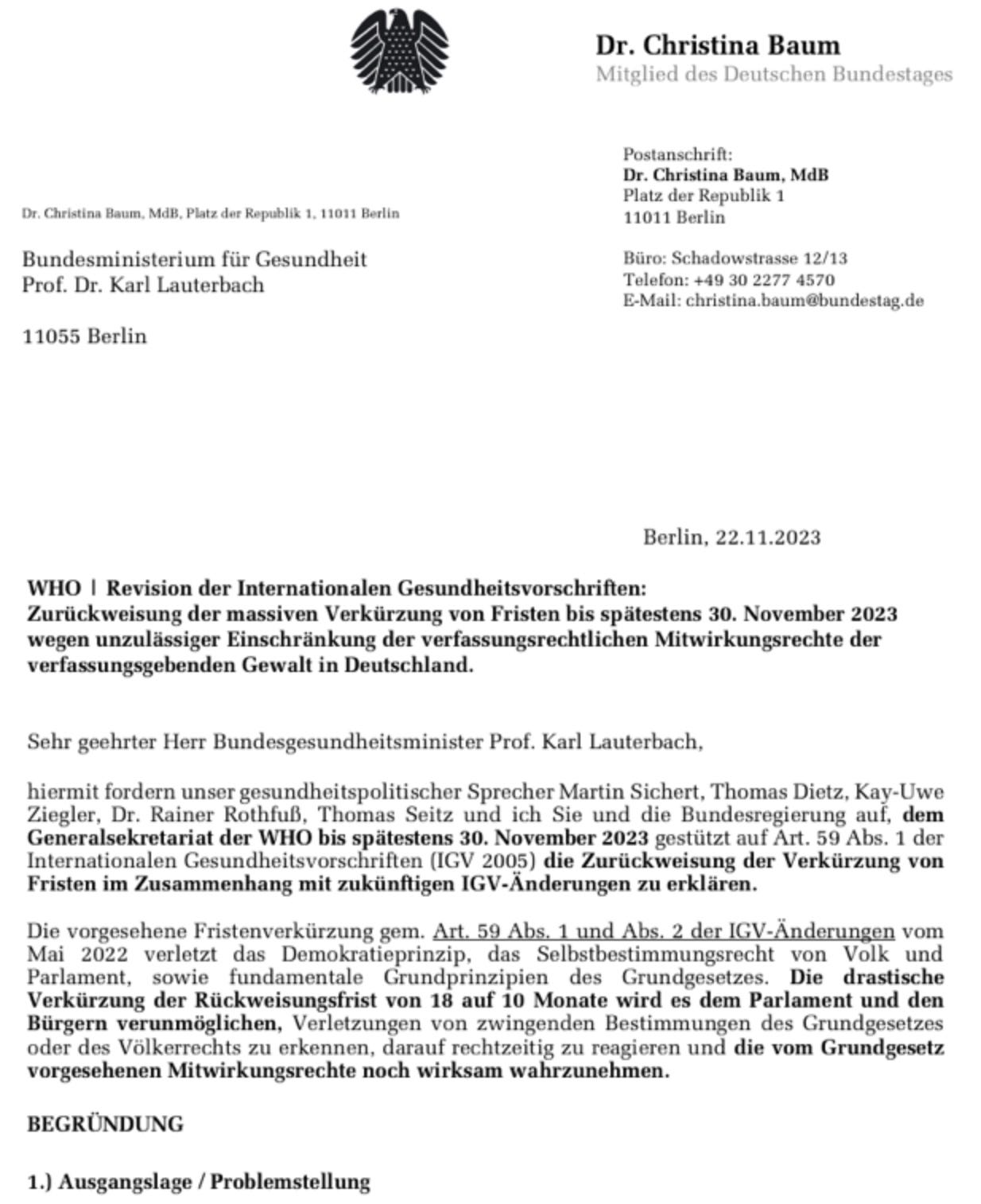 It looks as if this I'd a letter from AfD to Health Minister Lauterbach, asking HIM to write to WHO by 30 November. Which is the last thing Lauterbach of all people would do.