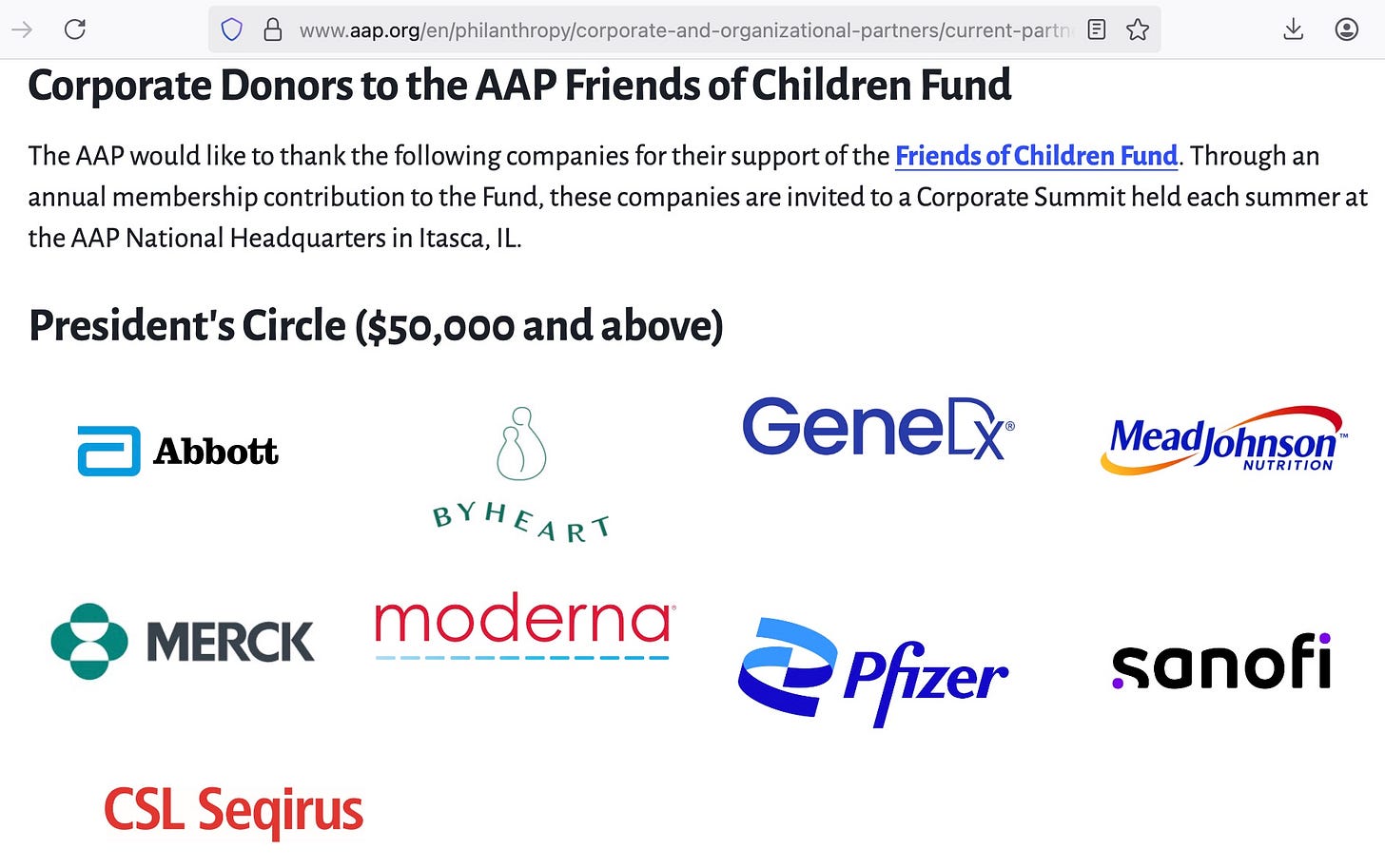 Funded by sources including Moderna, Merck, Sanofi, GSK, Eli Lilly, and other pharmaceutical companies, the AAP’s members are the cornerstone of the rapidly increasing pediatric pharma market in North America – by far greater than any other region. As a professional organization dedicated to ensuring income for its members, the AAP is like any similar professional association or union and acts in this manner.