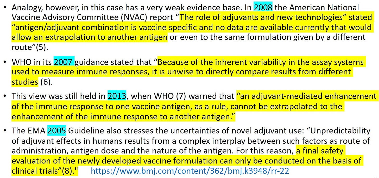 Trying “plug and play” with other vaccines has not worked, as the result of how vaccines with the new plug-in will perform cannot be known until tested in people. Dr. Tom Jefferson gave several examples of this in the BMJ, and I have previously shown a slide of his points, from which I have extracted below.