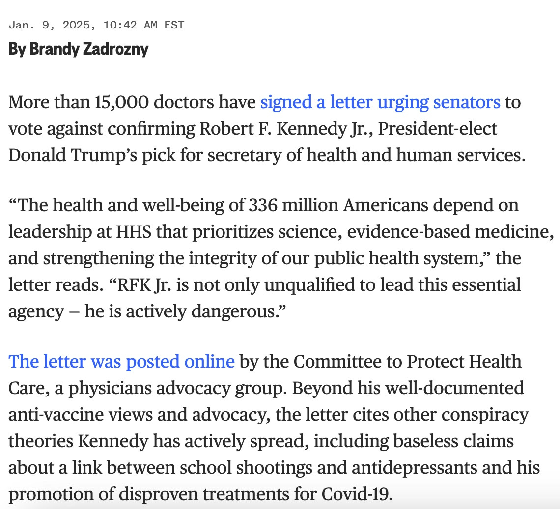 A (probably crooked) Democratic fundraising powerhouse (Act Blue) stood up a new astroturf organization of (allegedly) 15,000 doctors begging Senators to prevent RFK, Jr. from being confirmed as HHS Secretary, and used this strategy as a hook to seek more donations. They may have fooled some donors. Will they fool the Senate?