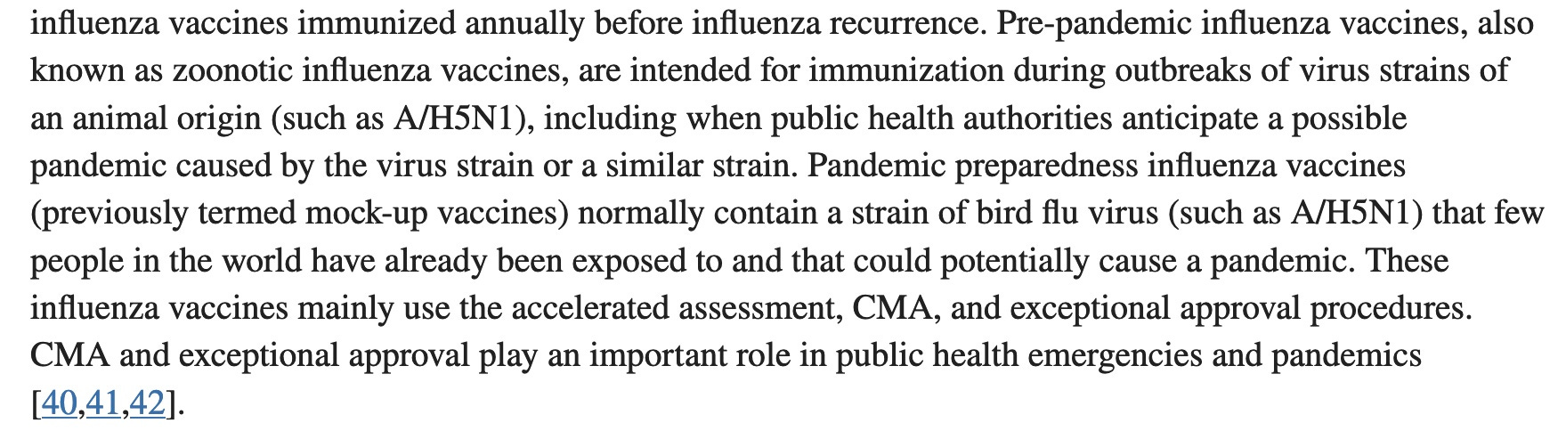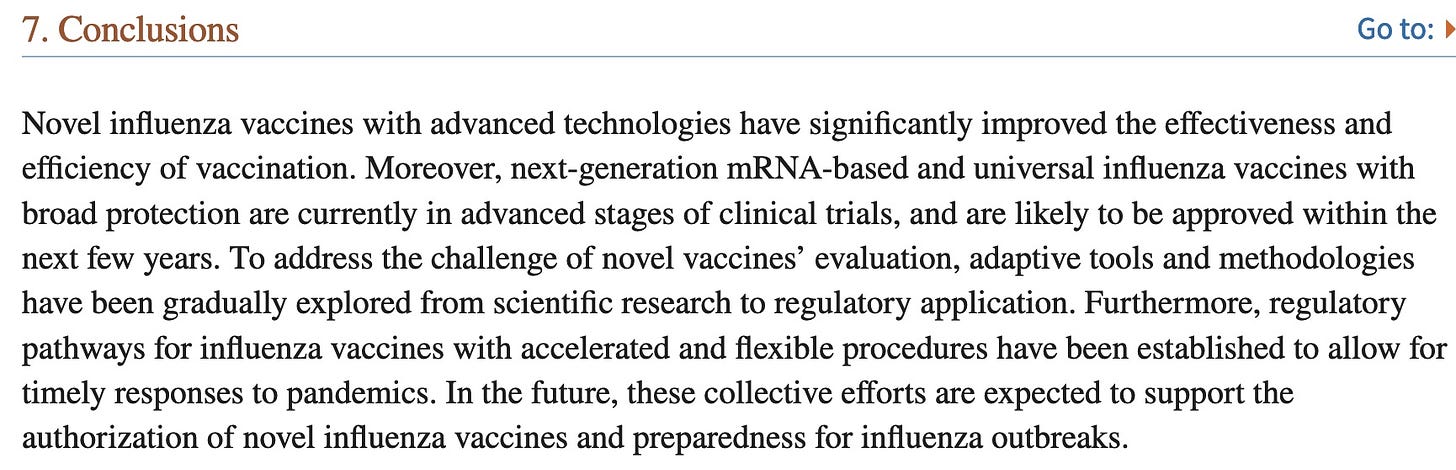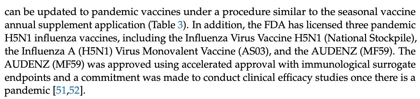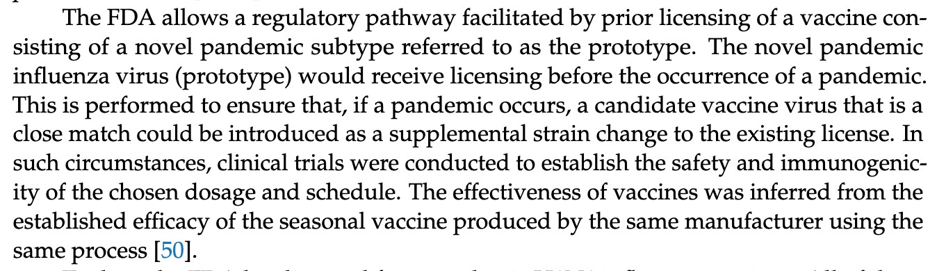 The above explains why 3 mock-up vaccines are already FDA-licensed for bird flu: so that any of their platforms can be used in a hurry. Note they do not use the words “efficacy” or “effectiveness” since the mock-ups were not tested to see if they work. The term “immunogenicity” simply means the vaccine induces antibodies. Which all vaccines do. Sometimes they are effective, sometimes not, and sometimes they induce a more severe disease. Effectiveness was “inferred”, i.e., surmised, based on the fact that seasonal flu vaccines seem to work. Though some years they don’t.