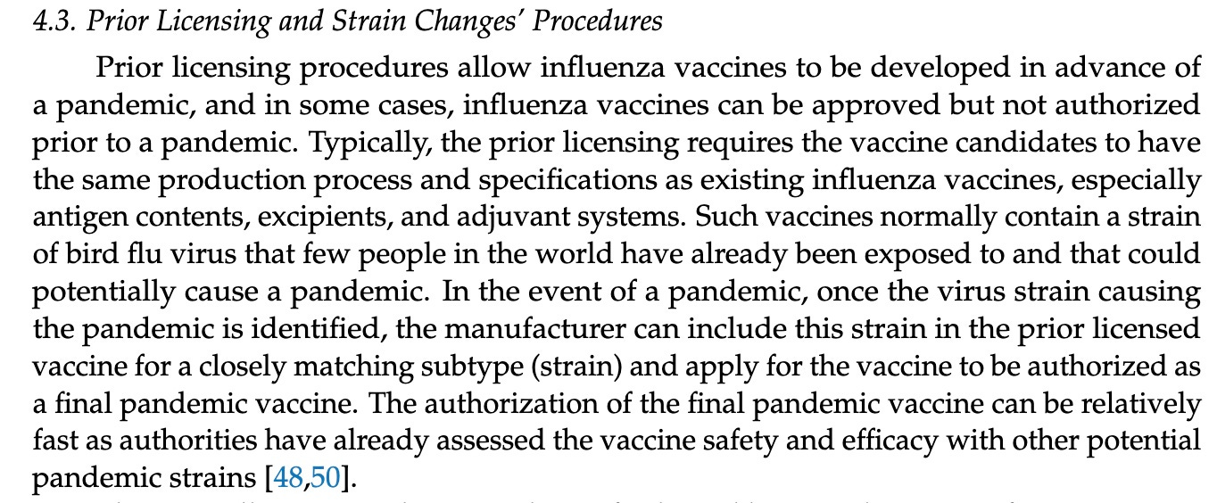 Note that these pre-vaccines “normally contain a strain of bird flu virus that few people in the world have already been exposed to…” This means the mock-up CANNOT be tested for efficacy since the infectious virus is not circulating. There is no population in which to test it. (If it was circulating, it would be a pandemic virus, not a pre-pandemic virus.)