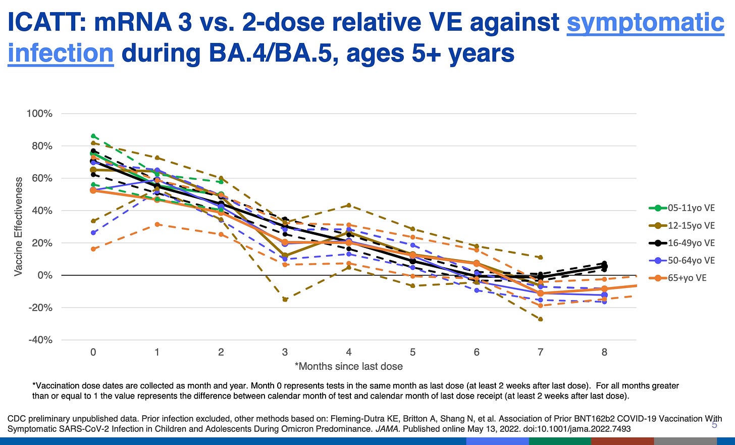 How well did the old vaccine work? The CDC slide below, presented by CDC's Dr. Link-Gelles, is not well labeled, but it shows that whether you got two or three doses of the old vaccine, during the omicron period efficacy in all age groups was under 40% at three months. By six months it hovered around zero efficacy (no benefit), and after that it was negative (harmful) for most ages.