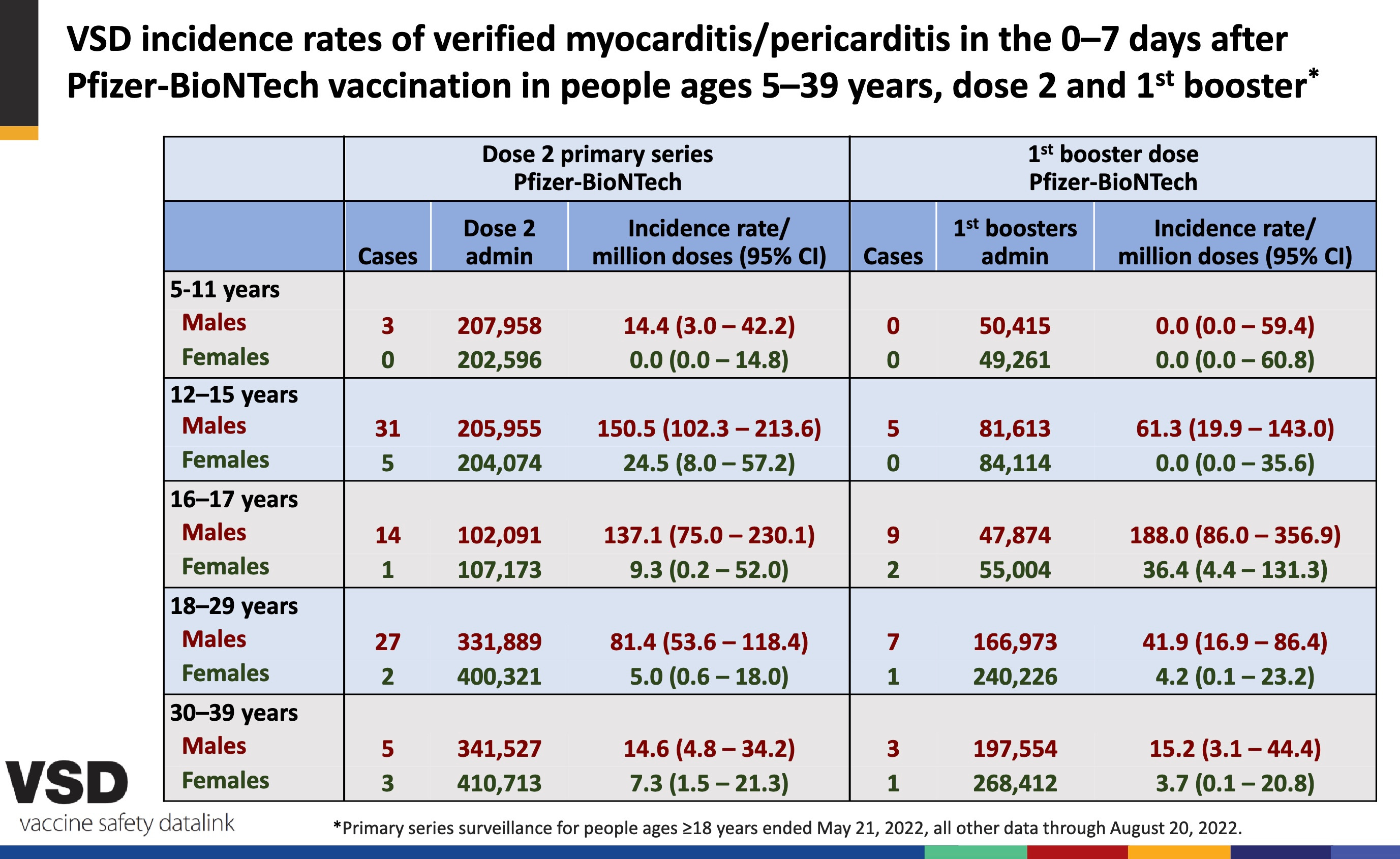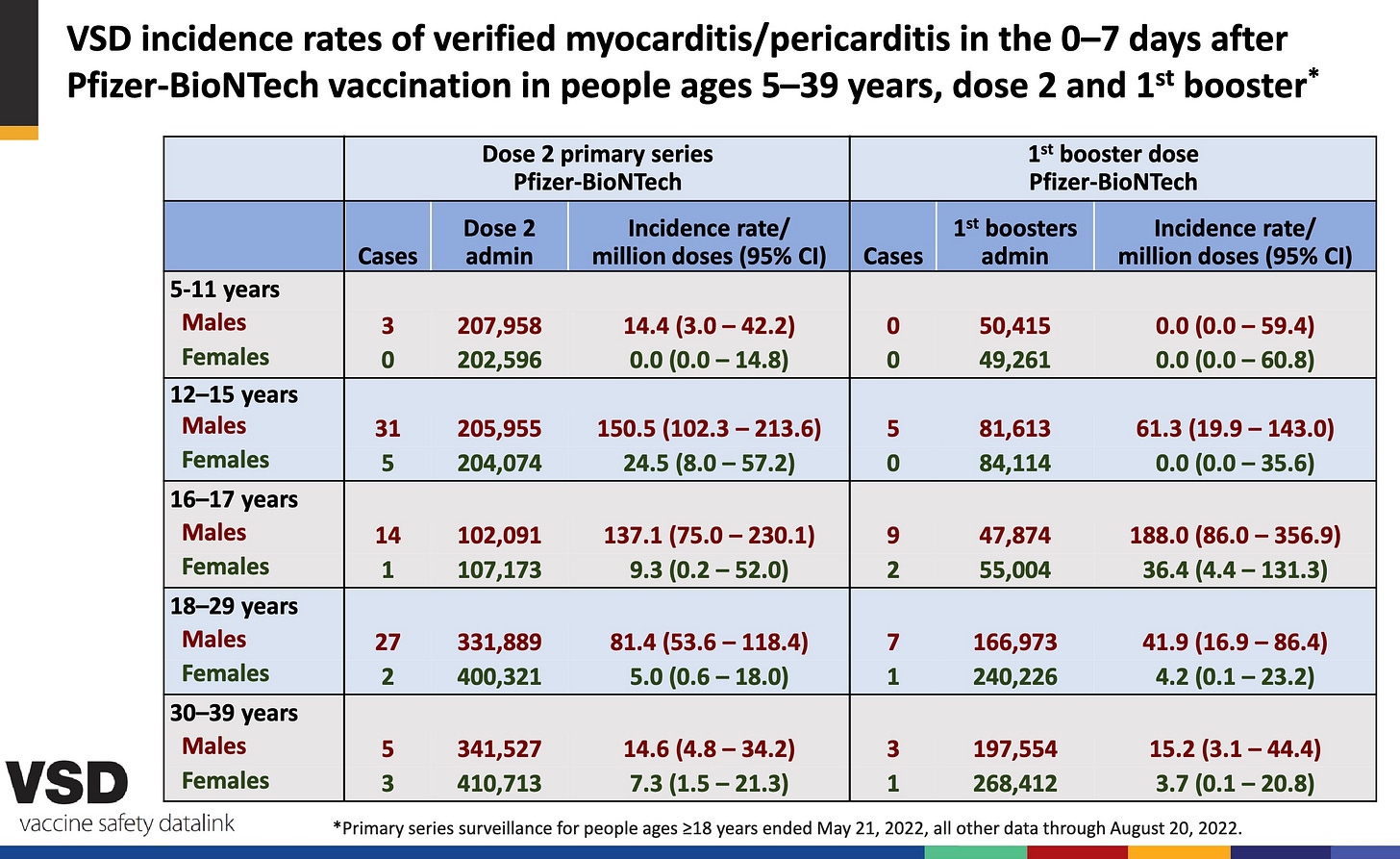 Presenters to the ACIP claimed that myocarditis was less common after booster shots of the old vaccine than after the second dose of the initial series. However, slide 39 shown by Dr. Shimabukuro, which was quickly passed over, showed the opposite. For 16-17 year-old boys and girls, and for men aged 30-39, the chance of myocarditis was increased after a booster. (See below.) So there is no reason to think the boosters will be any safer than the second dose, in terms of myocarditis. That risk, by the way, was about 1 in 2,000 young men aged 18-24 after their second dose in one Kaiser study.