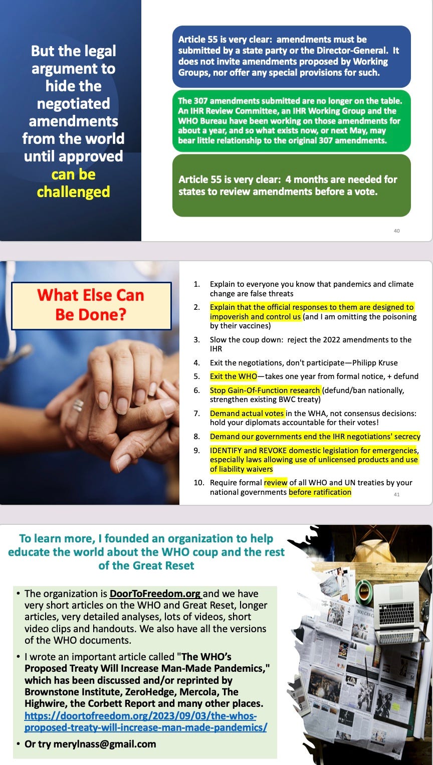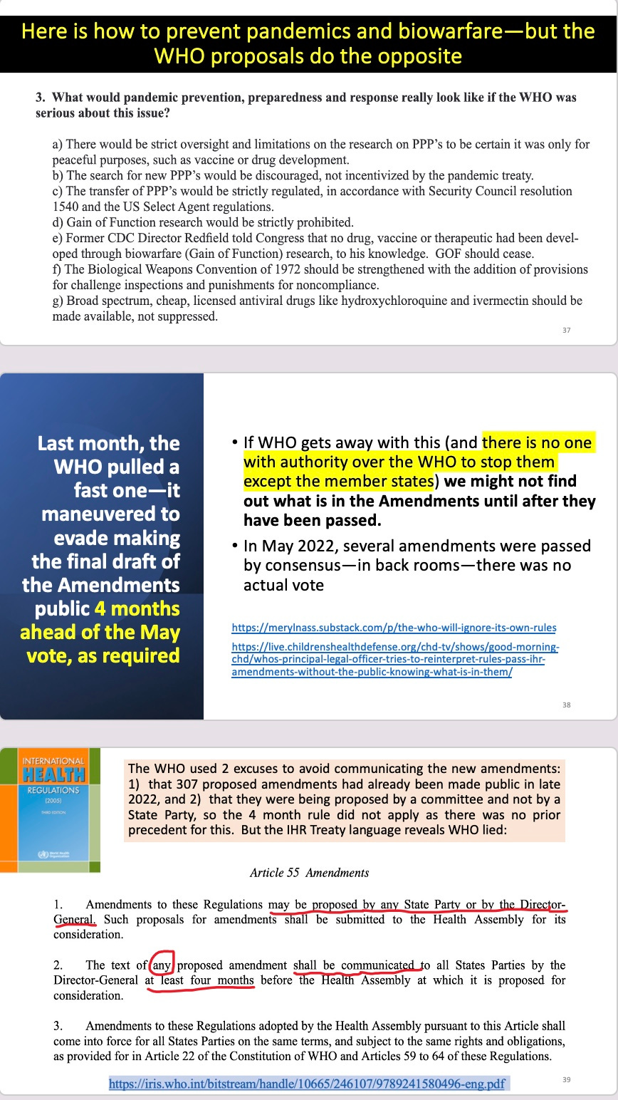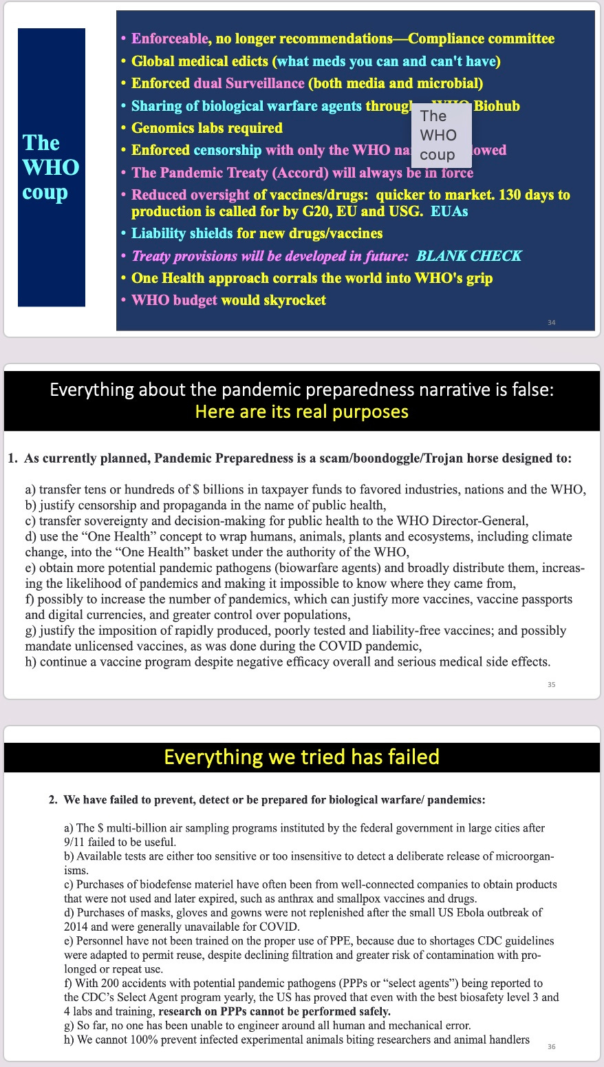 You can watch the whole event, or just me or certain talks. All my slides are posted below: my 20 minute version on the WHO-globalist coup (involving all the major multinational organizations)