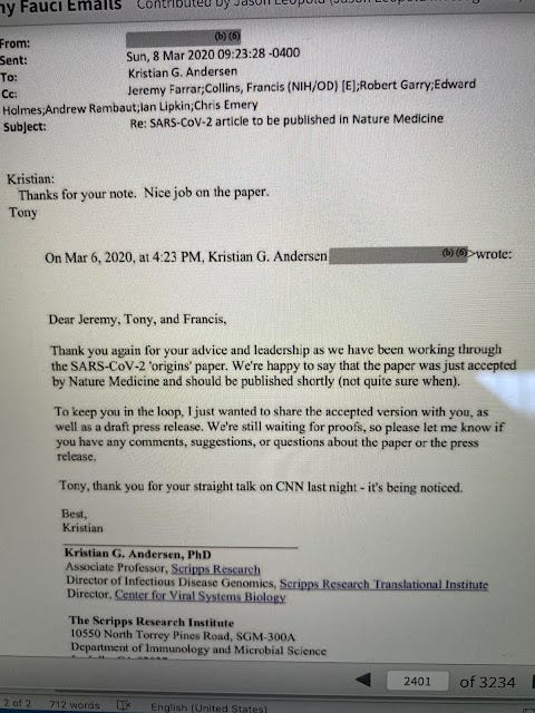 Today, I was sent a link by a reader (thanks!!!) to a specific one of Fauci's emails, and the mystery of why 5 well known scientists coauthored drivel, which the venerable Nature Medicine journal published, was solved.