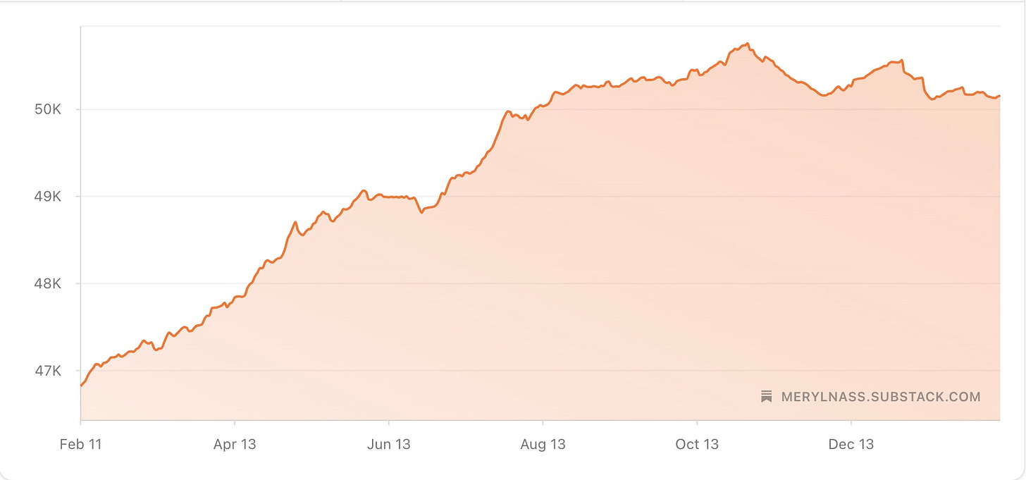 While subscription numbers make no sense. Total subscribers are just about what they were 6 months ago, when I hit 50,000. Paid subscribers have dropped by 22% since the peak, or 367 subscriptions.