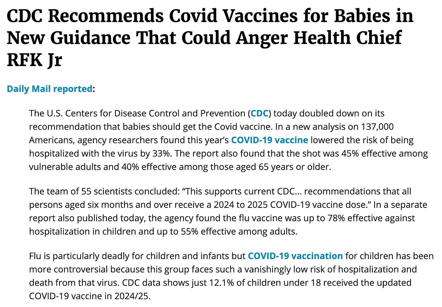 And Kennedy asks for the evidence on COVID vaccine clinical trial before allowing it to go forward, cancels flu shot advisory meeting, while CDC minions test him by pushing COVID vax today for babies