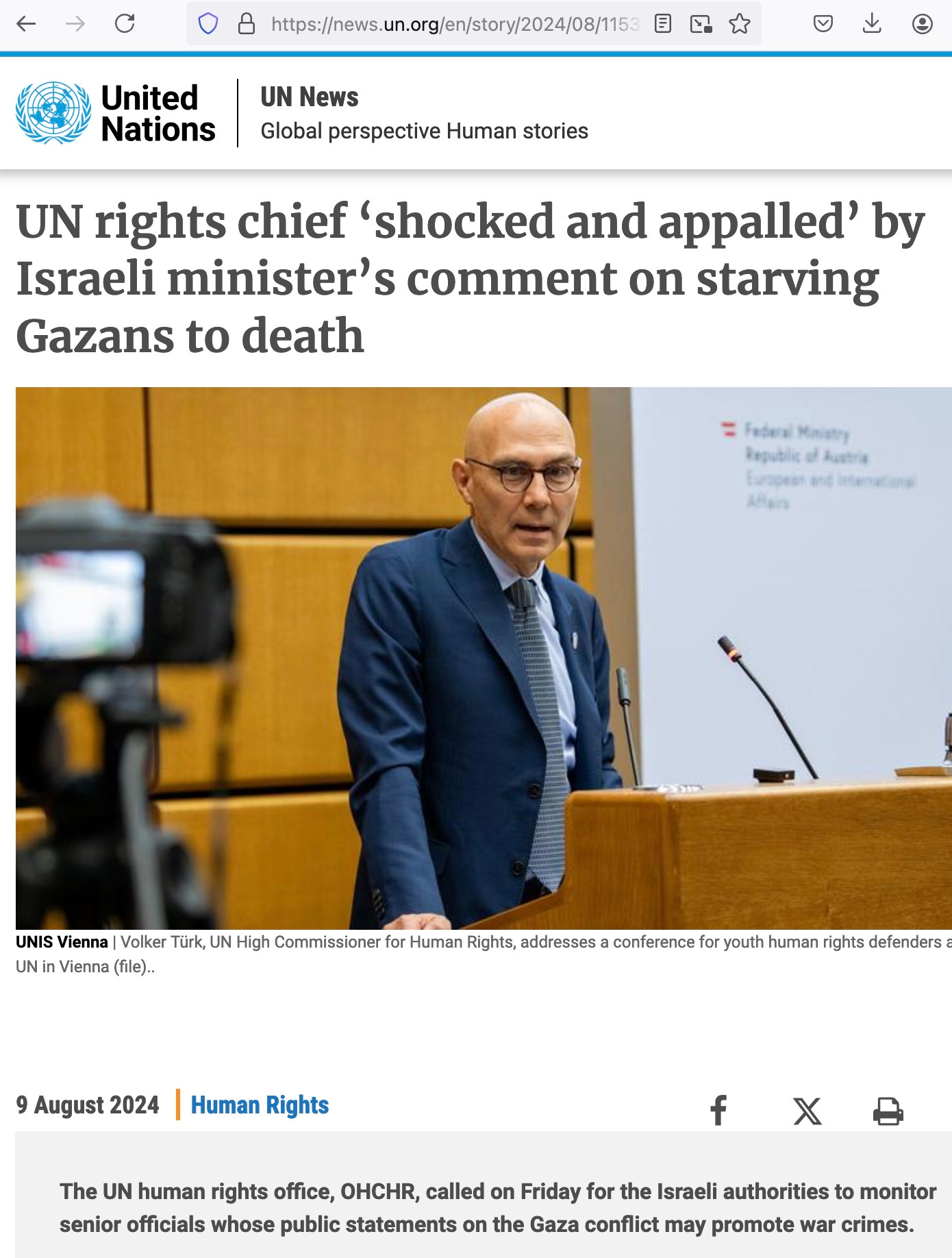 And what good is the UN and its High Commissioner for Human Rights? The best they can do is say that a top Israeli official’s admission that it would be a good idea to starve the Gazans to death is shocking and might promote war crimes. HELLO? We are constantly watching war crimes piled on war crimes and the world’s chief human rights officer brushes them off? The existence of these hypocrites provides everyone else cover, saving our governments from having to respond.