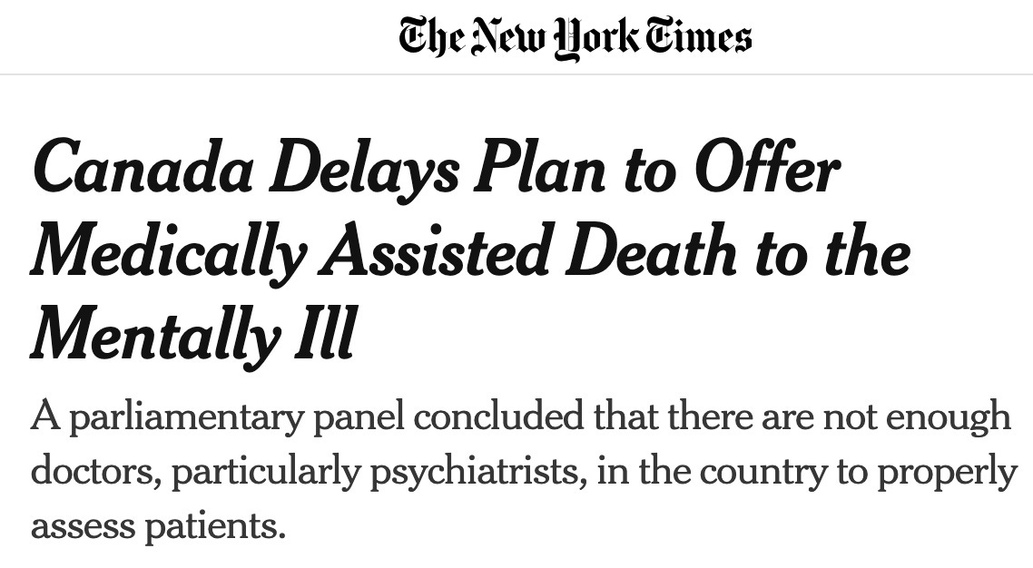 This is from the NYT. Fortunately there has been a reprieve for the suicidal. It was pointed out that suicidal patients could simply request to be put to death rather than get treated if “mental illness”—a broad category—became a justification for physician-assisted death.