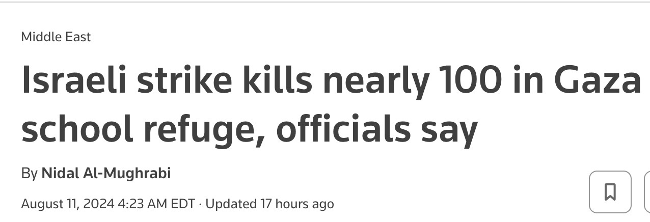 Israel: Serially expelling Gazans from their homes to grab choice real estate and offshore oil and gas, and maybe an aquifer while they are at it. Selecting hospitals, mosques and schools as targets. Traumatizing its own Israeli youth who are made to commit war crime after war crime. From Reuters: