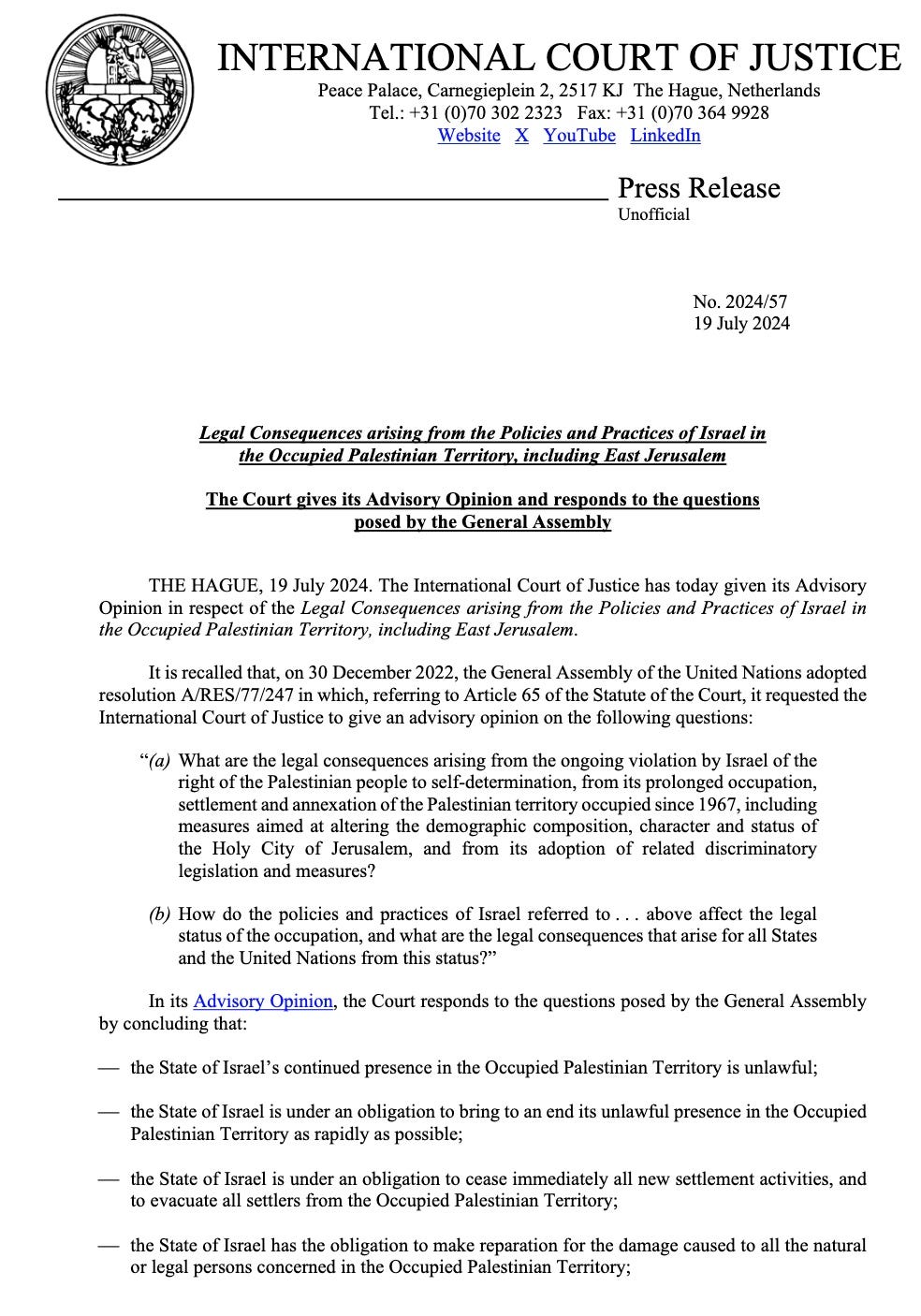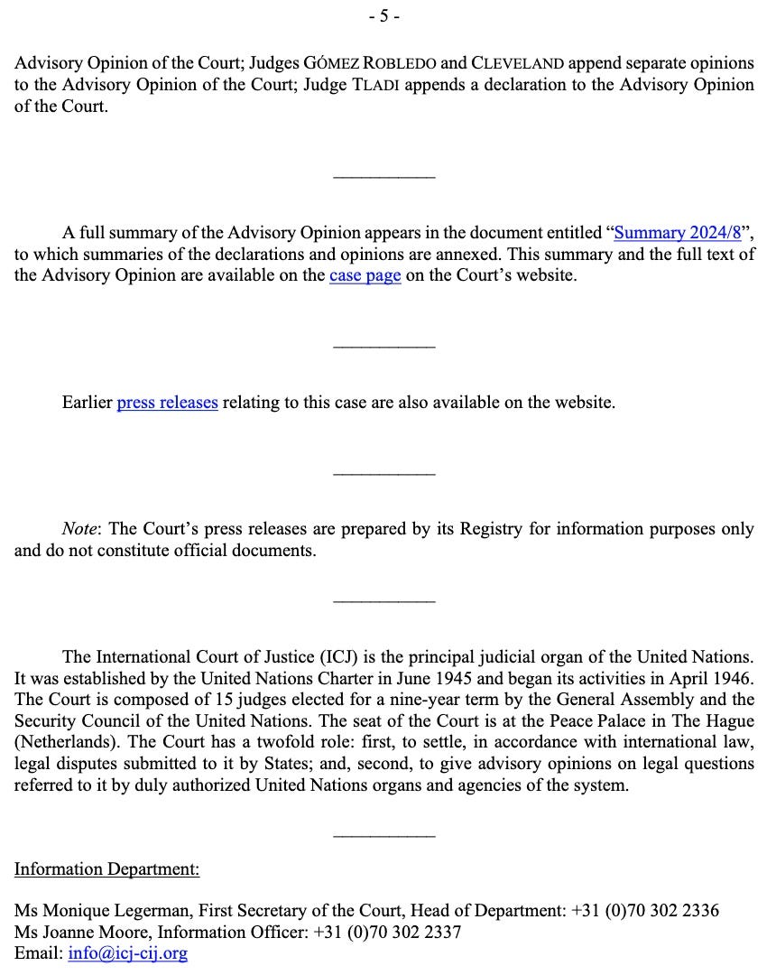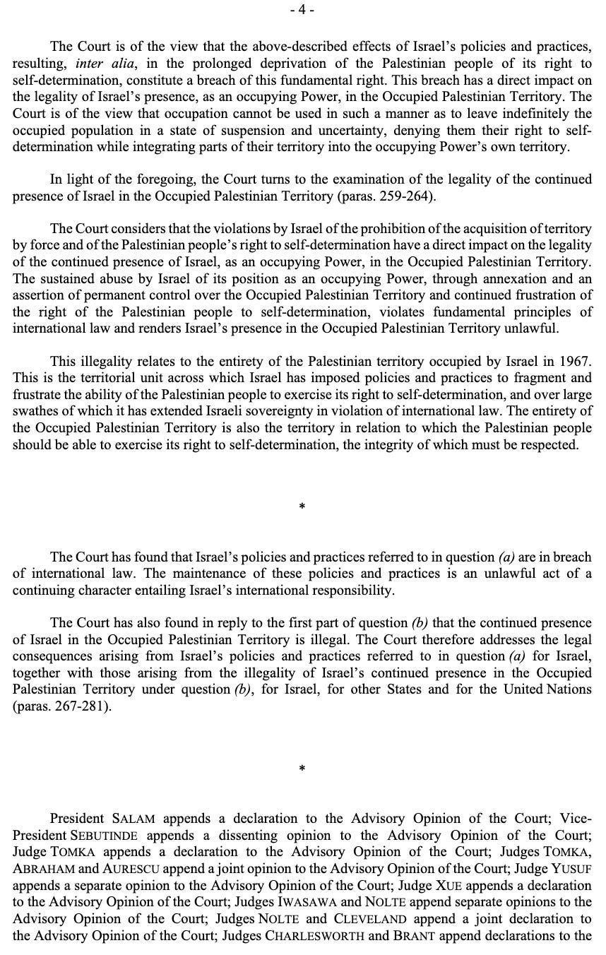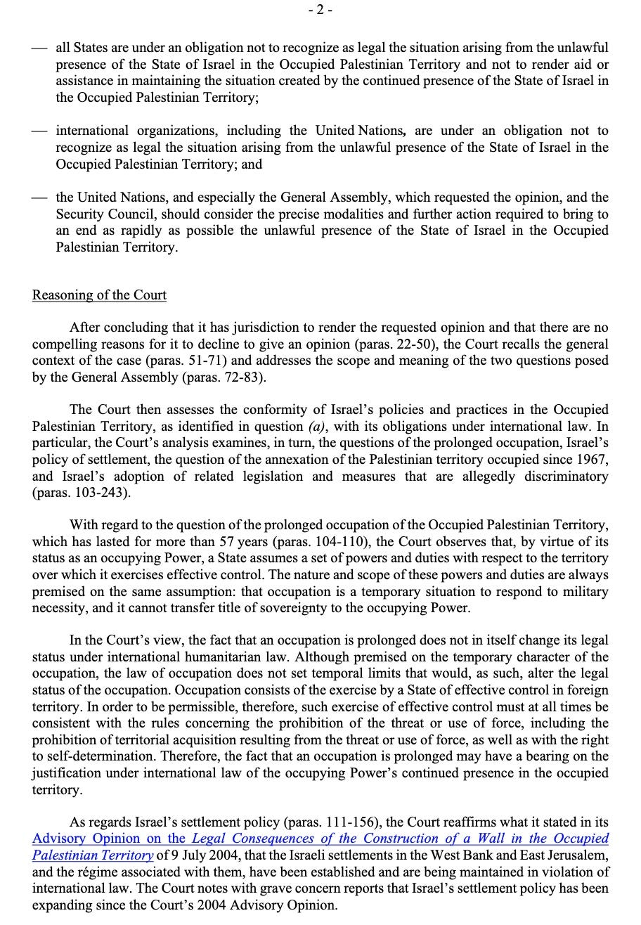 Here is the Advisory Opinion on Palestine, issued July 19, 2024. Below I have copied it.