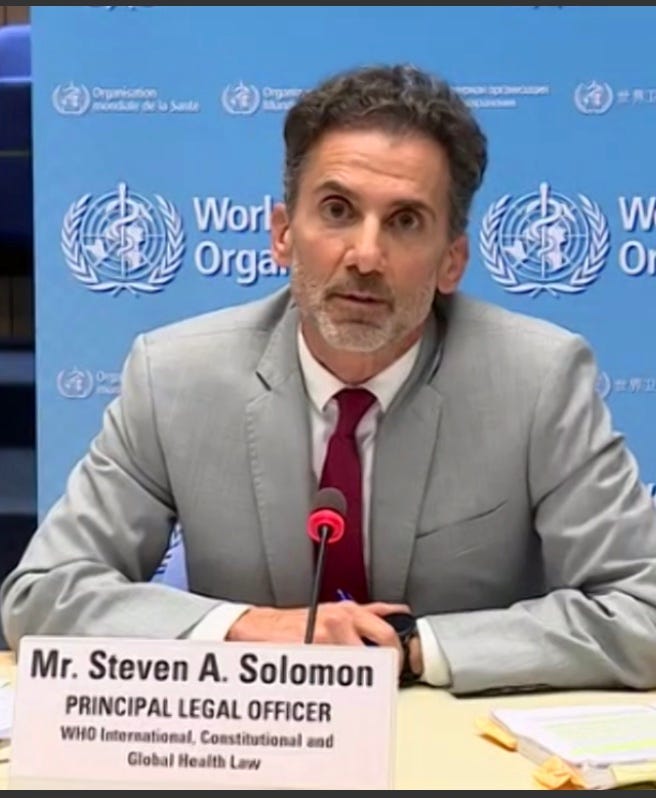 The WHO’s press release states what happened in very general terms, so only the already-initiated will understand it. Article 55 of the WHO Constitution requires that amendments to WHO documents be offered to the member states and public 4 months in advance of a vote. The Saudi co-chair said to the public that his Working Group on the IHR amendments may not complete their work by January needed to meet the timeline to be voted on in May 2024. In a choreographed move, he asked Principal Legal Officer Steven Solomon what to do about this. Solomon had already crafted a plan. His plan was to create a specious excuse to ignore the existing rules.