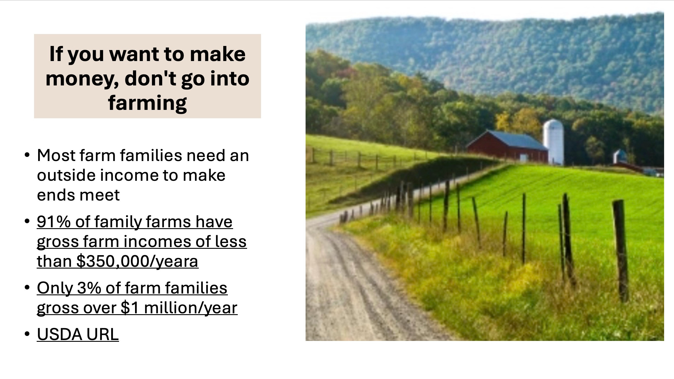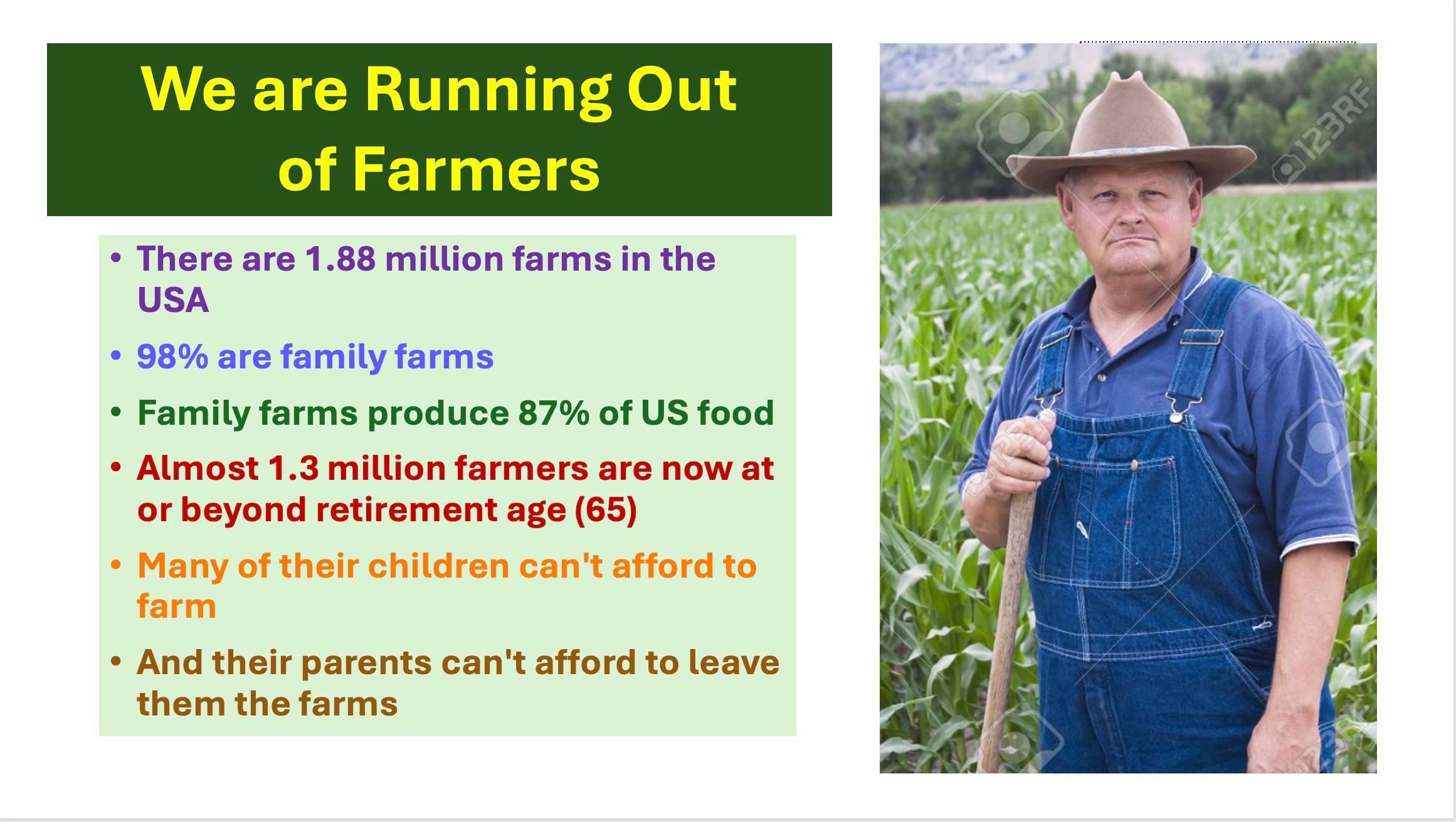 2/3 of US farmers (of our 1.9 million farms) are at or above retirement age! They are often in debt, and cannot afford to leave the farms to their children.