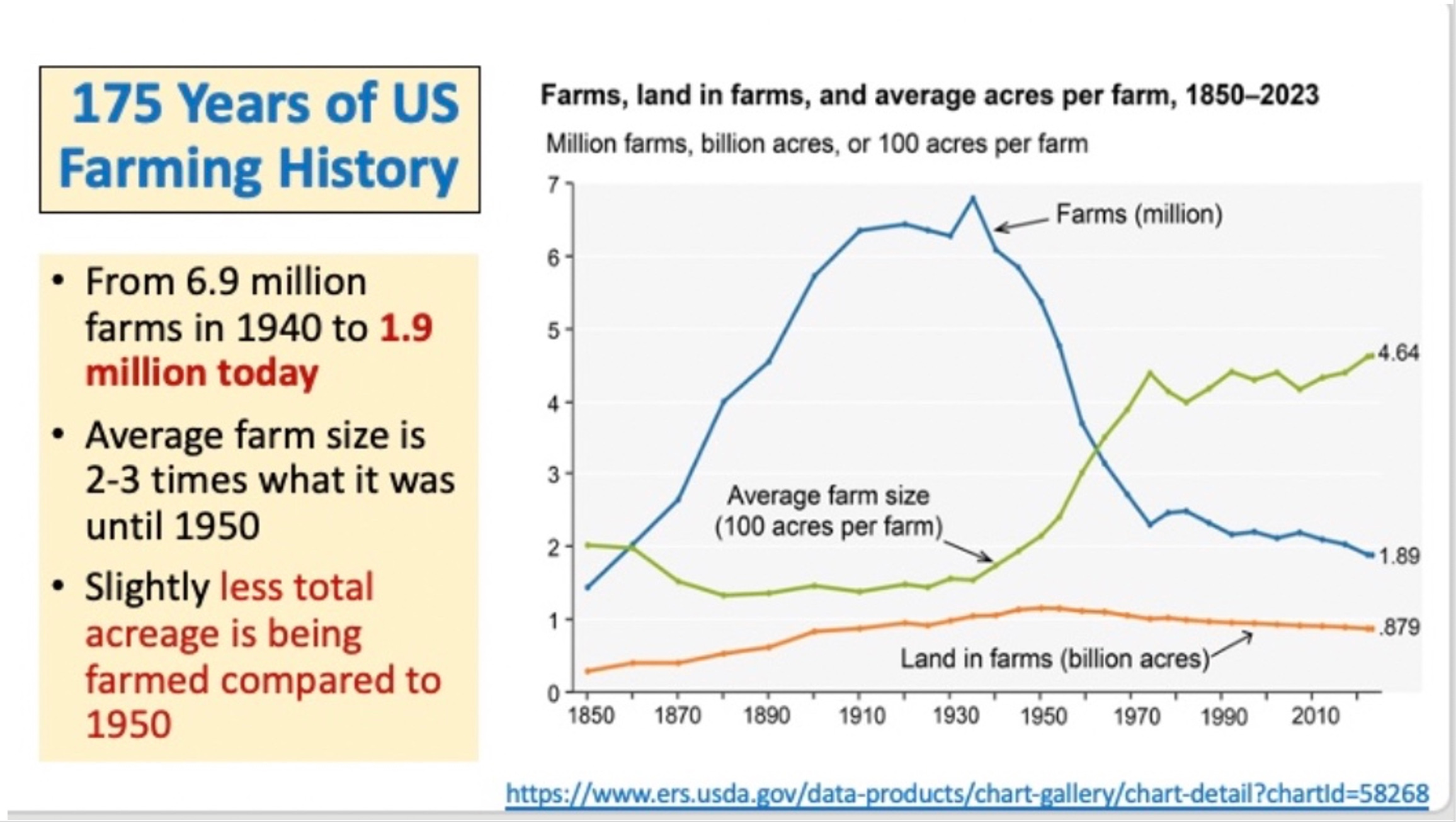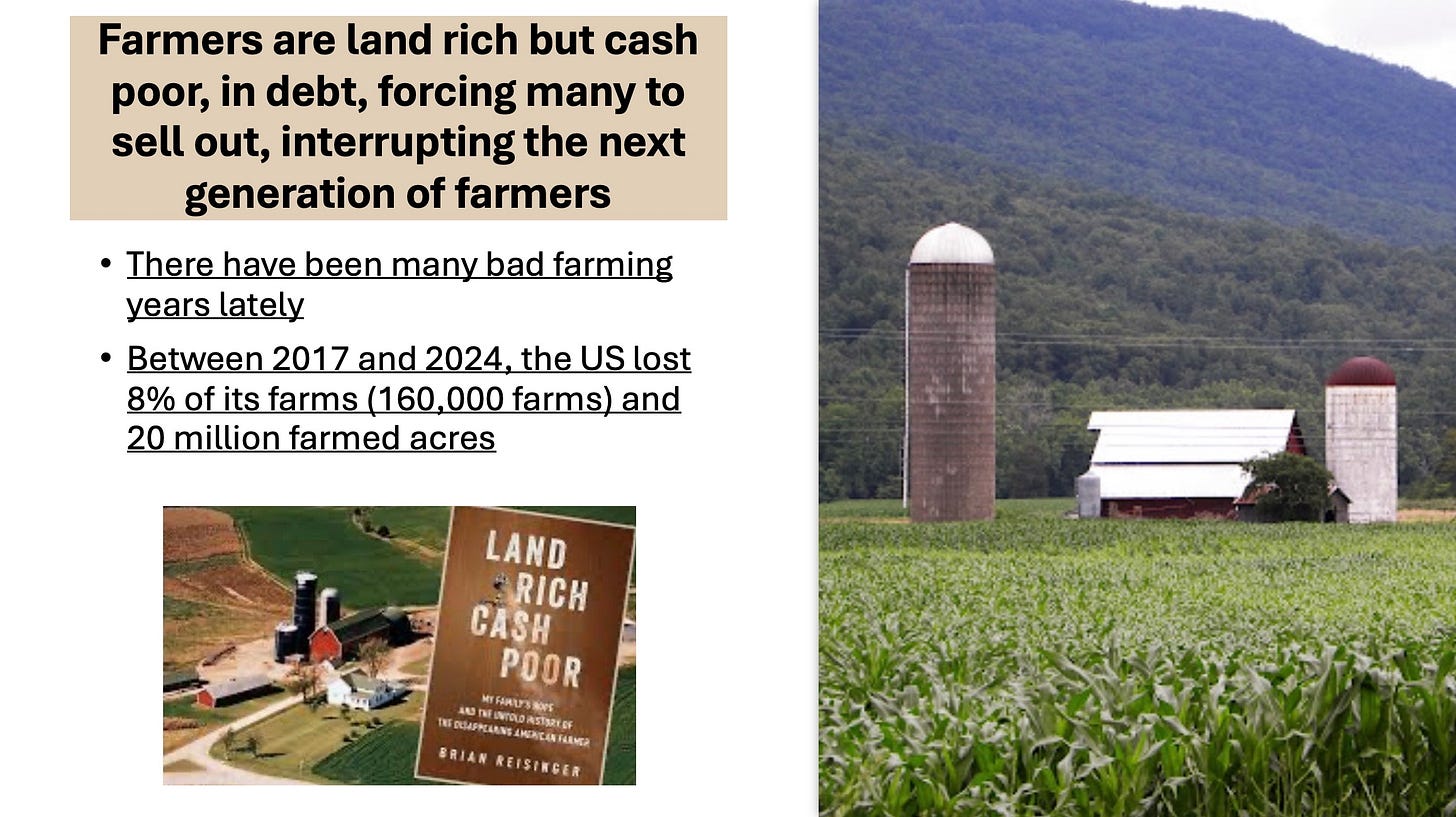 The US lost 160,000 farms between 2017 and 2024 and 20 million acres of farmland are no longer being farmed.