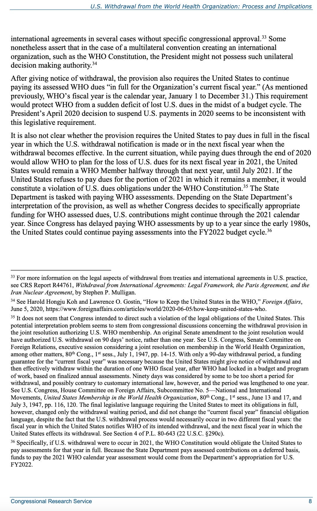 However, the Congressional Research Service studied the issue of the mechanics of leaving the WHO when Trump gave notice to the WHO in July 2020. You can read the entire report, or the relevant section below.
