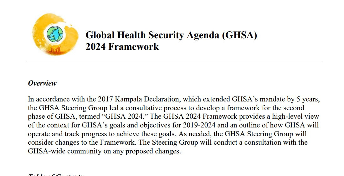 “Global Health Security Agenda (GHSA) is a growing partnership of more than 70 nations, international organizations, and non-governmental stakeholders that help build countries’ capacity to create a world safe and secure from infectious disease threats and elevate GHS as a national and global priority.” (The Global Health Security Agenda 2024 is a separate document)